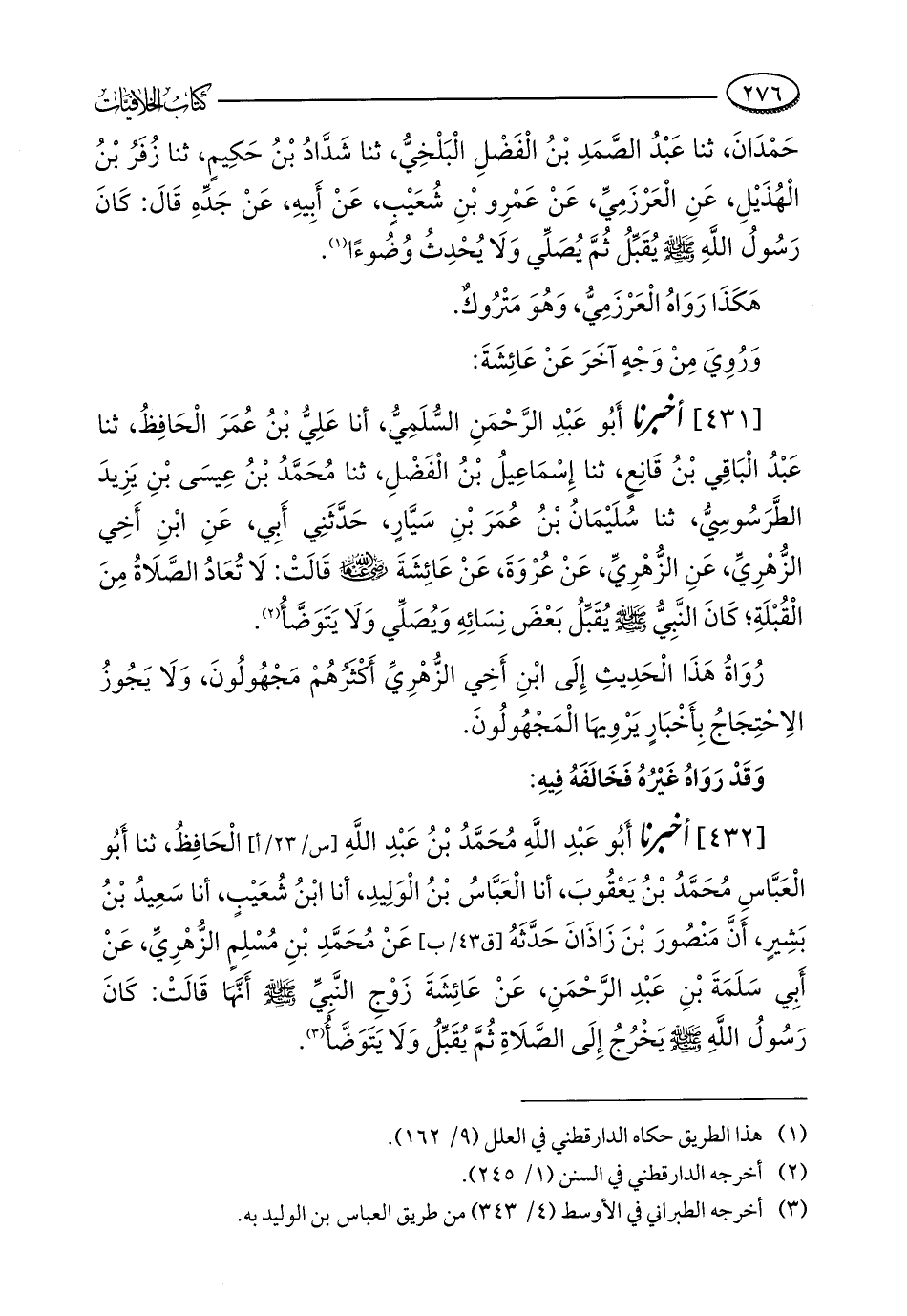 [431] أخبرنا أَبُو عَبْدِ الرَّحْمَنِ السُّلَمِيُّ، أنا عَلِيُّ بْنُ عُمَرَ الْحَافِظُ، ثنا عَبْدُ الْبَاقِي بْنُ قَانِعٍ، ثنا إِسْمَاعِيلُ بْنُ الْفَضْلِ، ثنا مُحَمَّدُ بْنُ عِيسَى بْنِ يَزِيدَ الطَّرَسُوسِيُّ، ثنا سُلَيْمَانُ بْنُ عُمَرَ بْنِ سَيَّارٍ، حَدَّثَنِي أَبِي، عَنِ ابْنِ أَخِي الزُّهْرِيِّ، عَنِ الزُّهْرِيِّ، عَنْ عُرْوَةَ، عَنْ عَائِشَةَ - رضي الله عنها - قَالَتْ: لَا تُعَادُ الصَّلَاةُ مِنَ الْقُبْلَةِ؛ كَانَ النَّبِيُّ - صلى الله عليه وسلم - يُقَبِّلُ بَعْضَ نِسَائِهِ وَيُصَلِّي وَلَا يَتَوَضَّأُ (¬2).