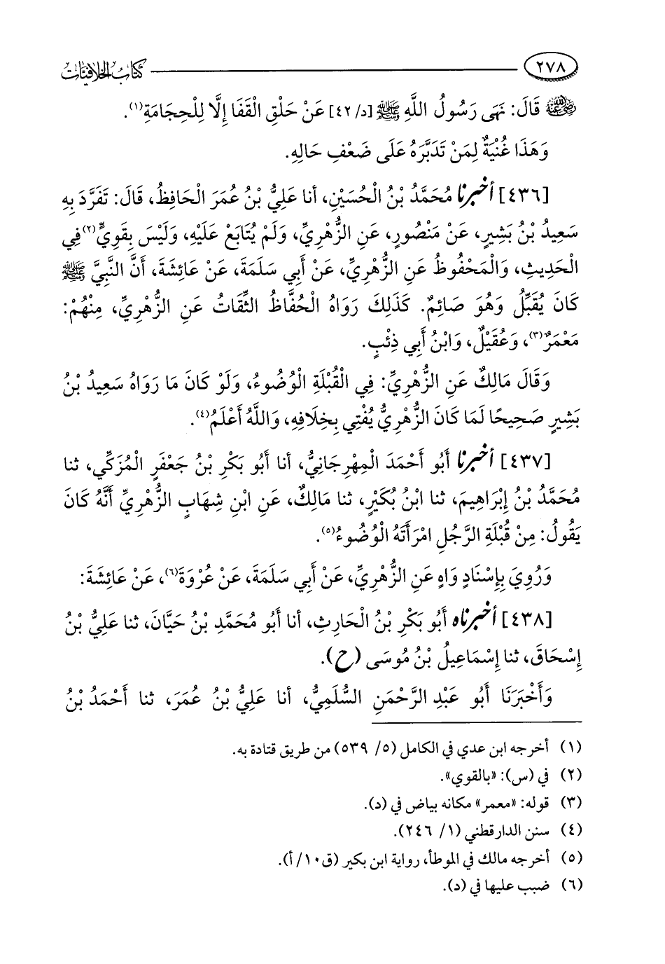 [436] أخبرنا مُحَمَّدُ بْنُ الْحُسَيْنِ، أنا عَلِيُّ بْنُ عُمَرَ الْحَافِظُ، قَالَ: تَفَرَّدَ بِهِ سَعِيدُ بْنُ بَشِيرٍ، عَنْ مَنْصُورٍ، عَنِ الزُّهْرِيِّ، وَلَمْ يُتَابَعْ عَلَيْهِ، وَلَيْسَ بقَوِيٍّ (¬2) فِي الْحَدِيثِ، وَالْمَحْفُوظُ عَنِ الزُّهْرِيِّ، عَنْ أَبِي سَلَمَةَ، عَنْ عَائِشَةَ، أَنَّ النَّبِيَّ - صلى الله عليه وسلم - كَانَ يُقَبِّلُ وَهُوَ صَائِمٌ. كَذَلِكَ رَوَاهُ الْحُفَّاظُ الثِّقَاتُ عَنِ الزُّهْرِيِّ، مِنْهُمْ: مَعْمَرٌ (¬3)، وَعُقَيْلٌ، وَابْنُ أَبِي ذِئْبٍ.