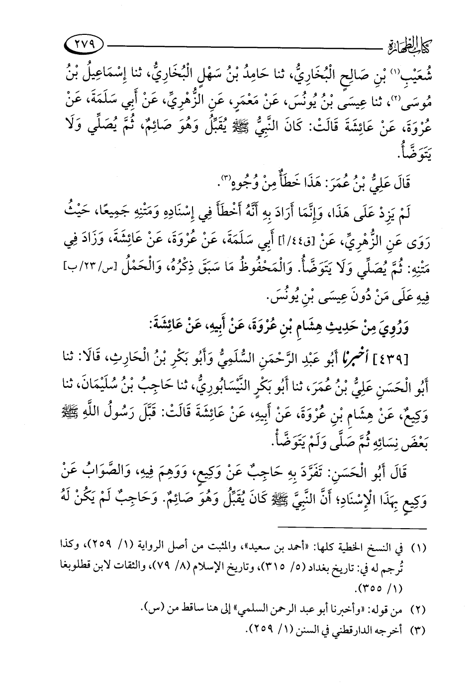 [439] أخبرنا أَبُو عَبْدِ الرَّحْمَنِ السُّلَمِيُّ وَأَبُو بَكْرِ بْنُ الْحَارِثِ، قَالَا: ثنا أَبُو الْحَسَنِ عَلِيُّ بْنُ عُمَرَ، ثنا أَبُو بَكْرٍ النَّيْسَابُورِيُّ، ثنا حَاجِبُ بْنُ سُلَيْمَانَ، ثنا وَكِيعٌ، عَنْ هِشَامِ بْنِ عُرْوَةَ، عَنْ أَبِيهِ، عَنْ عَائِشَةَ قَالَتْ: قَبَّلَ رَسُولُ اللَّهِ - صلى الله عليه وسلم - بَعْضَ نِسَائِهِ ثُمَّ صَلَّى وَلَمْ يَتَوَضَّأْ.