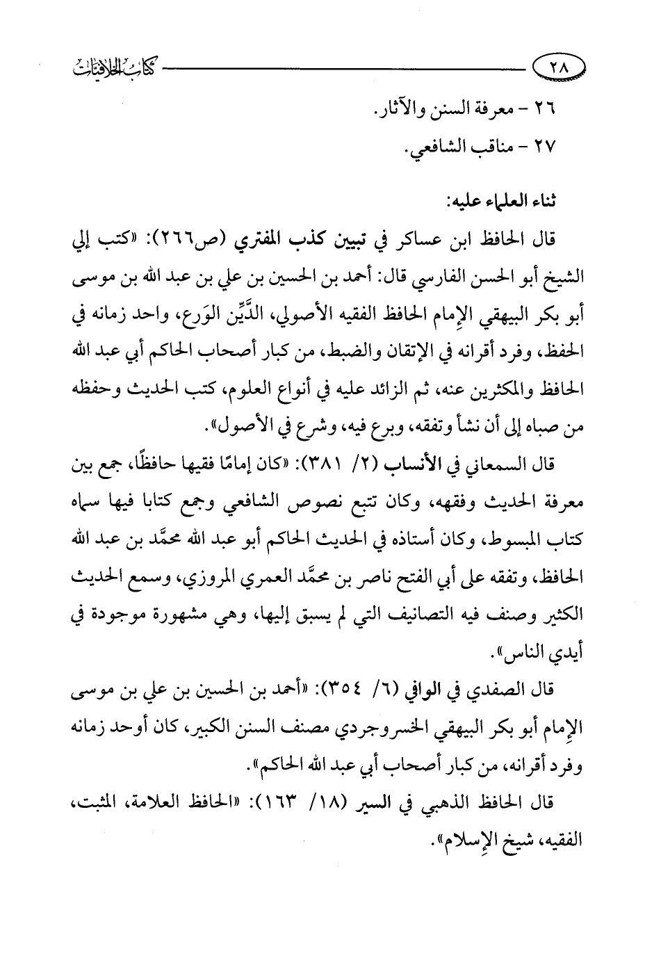 قال الصفدي في الوافي (6/ 354): "أحمد بن الحسين بن علي بن موسى الإِمام أبو بكر البيهقي الخسروجردي مصنف السنن الكبير، كان أوحد زمانه وفرد أقرانه، من كبار أصحاب أبي عبد الله الحاكم".