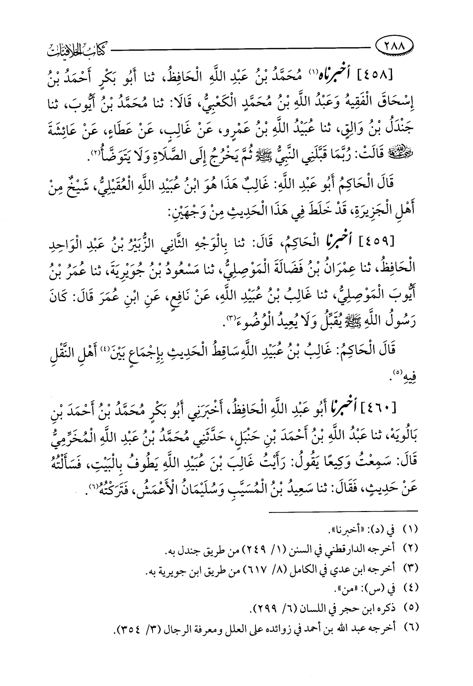 [459] أخبرنا الْحَاكِمُ، قَالَ: ثنا بِالْوَجْهِ الثَّانِي الزُّبَيْرُ بْنُ عَبْدِ الْوَاحِدِ الْحَافِظُ، ثنا عِمْرَانُ بْنُ فَضَالَةَ الْمَوْصِلِيُّ، ثنا مَسْعُودُ بْنُ جُوَيْرِيَةَ، ثنا عُمَرُ بْنُ أَيُّوبَ الْمَوْصِلِيُّ، ثنا غالِبُ بْنُ عُبَيْدِ اللَّهِ، عَنْ نَافِعٍ، عَنِ ابْنِ عُمَرَ قَالَ: كَانَ رَسُولُ اللَّهِ - صلى الله عليه وسلم - يقَبِّلُ وَلَا يُعِيدُ الْوُضُوءَ (¬3).