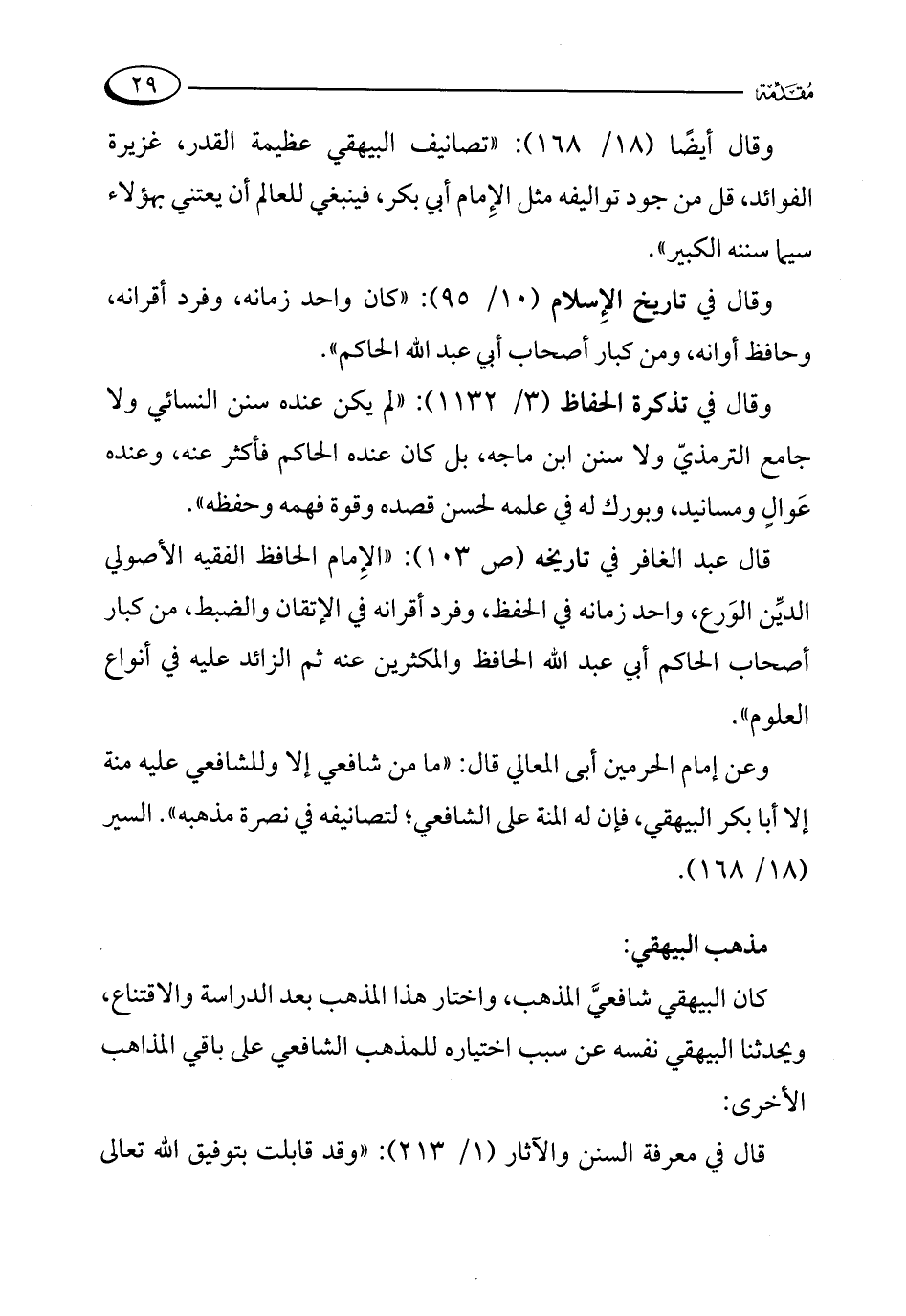 وعن إمام الحرمين أبى المعالي قال: "ما من شافعي إلا وللشافعي عليه منة إلا أبا بكر البيهقي، فإن له المنة على الشافعي؛ لتصانيفه في نصرة مذهبه". السير (18/ 168).