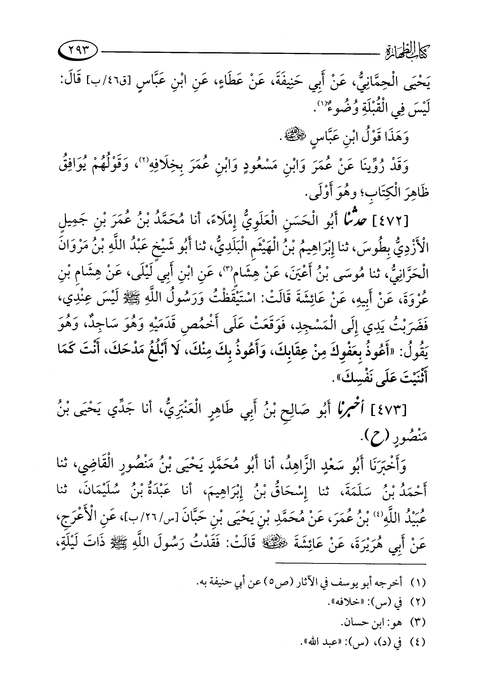 [472] حدثنا أَبُو الْحَسَنِ الْعَلَوِيُّ إِمْلَاءً، أنا مُحَمَّدُ بْنُ عُمَرَ بْنِ جَمِيلٍ الْأَزْدِيُّ بِطُوسَ، ثنا إِبْرَاهِيمُ بْنُ الْهَيْثَمِ الْبَلَدِيُّ، ثنا أَبُو شَيْخٍ عَبْدُ اللَّهِ بْنُ مَرْوَانَ الْحَرَّانِيُّ، ثنا مُوسَى بْنُ أَعْيَنَ، عَنْ هِشَامٍ (¬3)، عَنِ ابْنِ أَبِي لَيْلَى، عَنْ هِشَامِ بْنِ عُرْوَةَ، عَنْ أَبِيهِ، عَنْ عَائِشَةَ قَالَتْ: اسْتَيْقَظْتُ وَرَسُولُ اللَّهِ - صلى الله عليه وسلم - لَيْسَ عِنْدِي، فَضَرَبْتُ يَدِي إِلَى الْمَسْجِدِ، فَوَقَعَتْ عَلَى أَخْمُصِ قَدَمَيْهِ وَهُوَ سَاجِدٌ، وَهُوَ يَقُولُ: "أَعُوذُ بِعَفْوِكَ مِنْ عِقَابِكَ، وَأَعُوذُ بِكَ مِنْكَ، لَا أَبْلُغُ مَدْحَكَ، أَنْتَ كَمَا أَثْنَيْتَ عَلَى نَفْسِكَ".