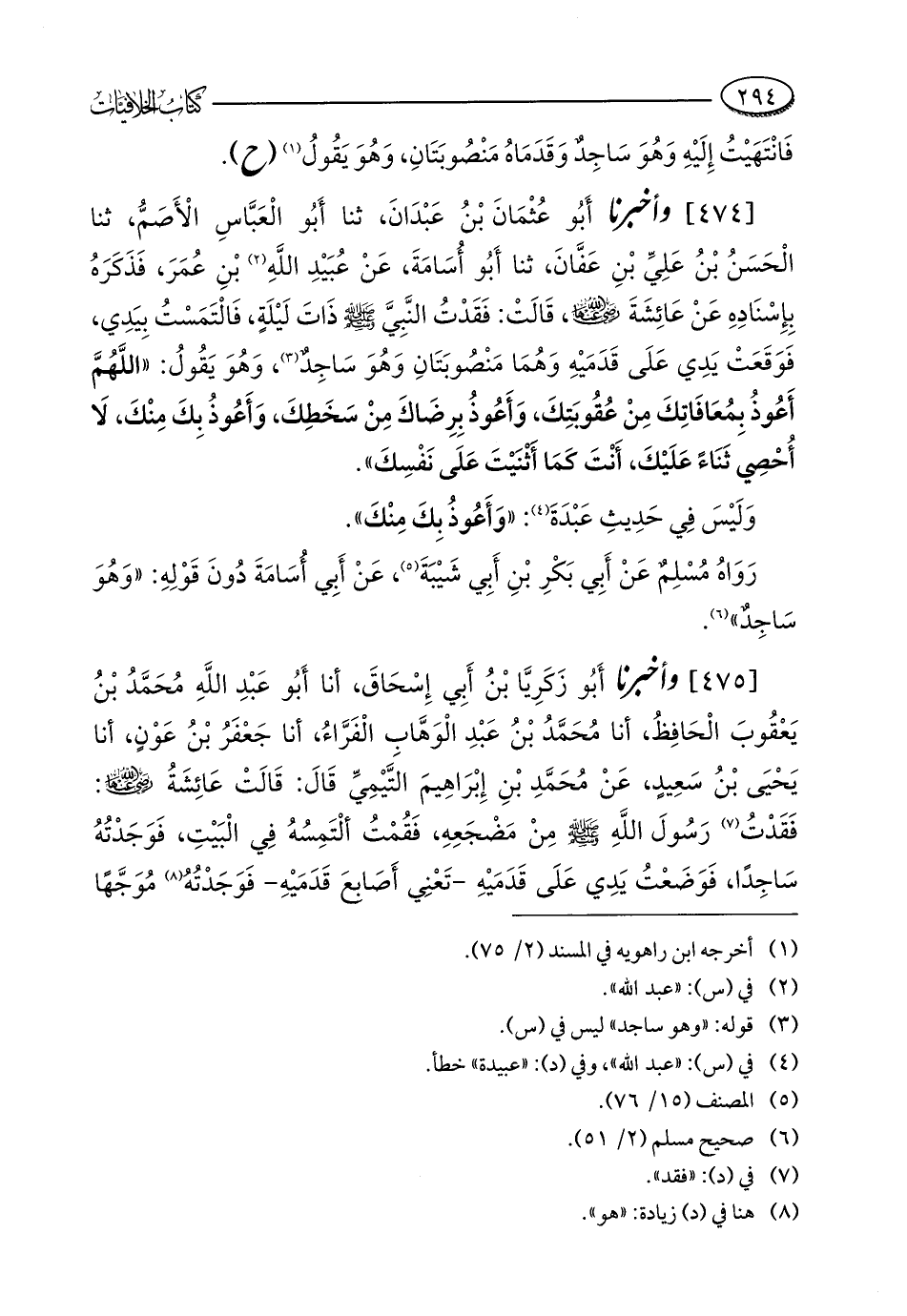 [474] وأخبرنا أَبُو عُثْمَانَ بْنُ عَبْدَانَ، ثنا أَبُو الْعَبَّاسِ الْأَصَمُّ، ثنا الْحَسَنُ بْنُ عَلِيِّ بْنِ عَفَّانَ، ثنا أَبُو أُسَامَةَ، عَنْ عُبَيْدِ اللَّهِ (¬2) بْنِ عُمَرَ، فَذَكَرَهُ بِإِسْنَادِهِ عَنْ عَائِشَةَ - رضي الله عنها -، قَالَتْ: فَقَدْتُ النَّبِيَّ - صلى الله عليه وسلم - ذَاتَ لَيْلَةٍ، فَالْتَمَسْتُ بِيَدِي، فَوَقَعَتْ يَدِي عَلَى قَدَمَيْهِ وَهُمَا مَنْصُوبَتَانِ وَهُوَ سَاجِدٌ (¬3)، وَهُوَ يَقُولُ: "اللَّهُمَّ أَعُوذُ بِمُعَافَاتِكَ مِنْ عُقُوبَتِكَ، وَأَعُوذُ بِرِضَاكَ مِنْ سَخَطِكَ، وَأَعُوذُ بِكَ مِنْكَ، لَا أُحْصِي ثَنَاءً عَلَيْكَ، أَنْتَ كَمَا أَثْنَيْتَ عَلَى نَفْسِكَ".