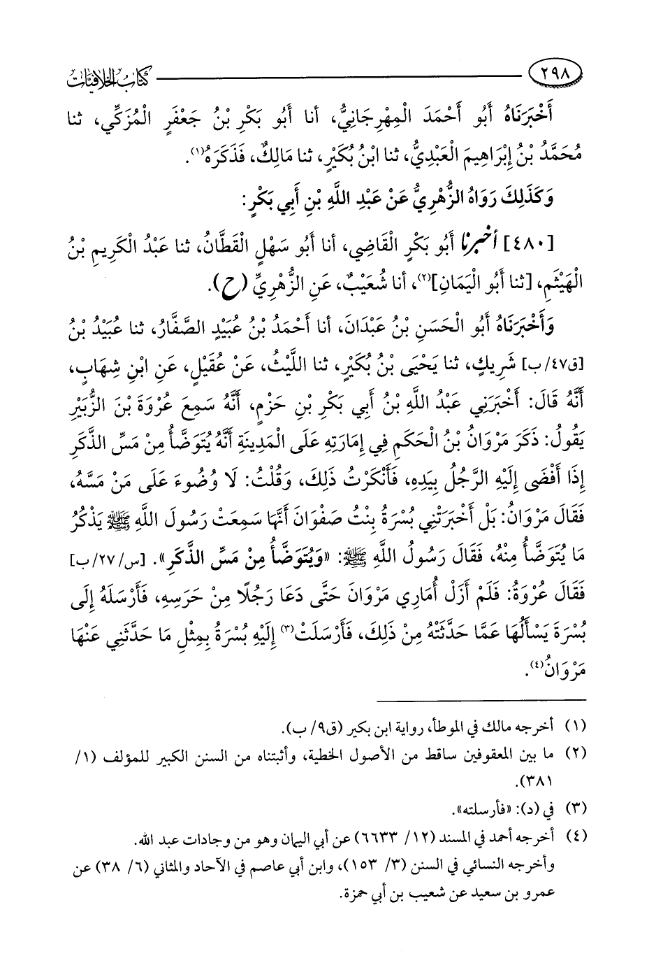وَأَخْبَرَنَاهُ أَبُو الْحَسَنِ بْنُ عَبْدَانَ، أنا أَحْمَدُ بْنُ عُبَيْدٍ الصَّفَّارُ، ثنا عُبَيْدُ بْنُ شَرِيكٍ، ثنا يَحْيَى بْنُ بُكَيْرٍ، ثنا اللَّيْثُ، عَنْ عُقَيْلٍ، عَنِ ابْنِ شِهَابٍ، أَنَّهُ قَالَ: أَخْبَرَنِي عَبْدُ اللَّهِ بْنُ أَبِي بَكْرِ بْنِ حَزْمٍ، أَنَّهُ سَمِعَ عُرْوَةَ بْنَ الزُّبَيْرِ يَقُولُ: ذَكَرَ مَرْوَانُ بْنُ الْحَكَمِ فِي إِمَارَتِهِ عَلَى الْمَدِينَةِ أَنَّهُ يُتَوَضَّأُ مِنْ مَسِّ الذَّكَرِ إِذَا أَفْضَى إِلَيْهِ الرَّجُلُ بِيَدِهِ، فَأَنْكَرْتُ ذَلِكَ، وَقُلْتُ: لَا وُضُوءَ عَلَى مَنْ مَسَّهُ، فَقَالَ مَرْوَانُ: بَلْ أَخْبَرَتْنِي بُسْرَةُ بِنْتُ صَفْوَانَ أَنَّهَا سَمِعَتْ رَسُولَ اللَّهِ - صلى الله عليه وسلم - يَذْكُرُ مَا يُتَوَضَّأُ مِنْهُ، فَقَالَ رَسُولُ اللَّهِ - صلى الله عليه وسلم -: "وَيُتَوَضَّأُ مِنْ مَسِّ الذَّكَرِ". فَقَالَ عُرْوَةُ: فَلَمْ أَزَلْ أُمَارِي مَرْوَانَ حَتَّى دَعَا رَجُلًا مِنْ حَرَسِهِ، فَأَرْسَلَهُ إِلَى بُسْرَةَ يَسْأَلُهَا عَمَّا حَدَّثَتْهُ مِنْ ذَلِكَ، فَأَرْسَلَتْ (¬3) إِلَيْهِ بُسْرَةُ بِمِثْلِ مَا حَدَّثَنِي عَنْهَا مَرْوَانُ (¬4).