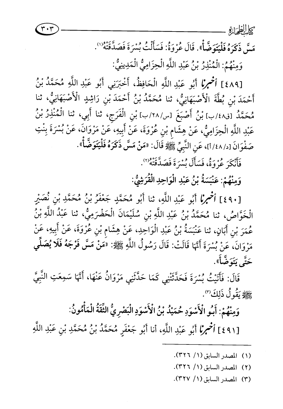 [489] أخبرنا أَبُو عَبْدِ اللَّهِ الْحَافِظُ، أَخْبَرَنِي أَبُو عَبْدِ اللَّهِ مُحَمَّدُ بْنُ أَحْمَدَ بْنِ بُطَّةَ الْأَصْبَهَانِيُّ، ثنا مُحَمَّدُ بْنُ أَحْمَدَ بْنِ رَاشِدٍ الْأَصْبَهَانِيُّ، ثنا مُحَمَّدُ بْنُ أَصْبَغَ بْنِ الْفَرَجِ، ثنا أَبِي، ثنا الْمُنْذِرُ بْنُ عَبْدِ اللَّهِ الْحِزَامِيُّ، عَنْ هِشَامِ بْنِ عُرْوَةَ، عَنْ أَبِيهِ، عَنْ مَرْوَانَ، عَنْ بُسْرَةَ بِنْتِ صَفْوَانَ عَنِ النَّبِيِّ - صلى الله عليه وسلم - قَالَ: "مَنْ مَسَّ ذَكَرَهُ فَلْيَتَوَضَّأْ".