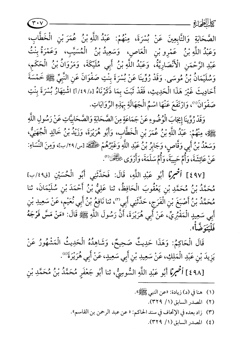 الصَّحَابَةِ وَالتَّابِعِينَ عَنْ بُسْرَةَ، مِنْهُمْ: عَبْدُ اللَّهِ بْنُ عُمَرَ بْنِ الْخَطَّابِ، وَعَبْدُ اللَّهِ بْنُ عَمْرِو بْنِ الْعَاصِ، وَسَعِيدُ بْنُ الْمُسَيَّبِ، وَعَمْرَةُ بِنْتُ عَبْدِ الرَّحْمَنِ الْأَنْصَارِيَّةُ، وَعَبْدُ اللَّهِ بْنُ أَبِي مُلَيْكَةَ، وَمَرْوَانُ بْنُ الْحَكَمِ، وَسُلَيْمَانُ بْنُ مُوسَى. وَقَدْ رُوِّينَا عَنْ بُسْرَةَ بِنْتِ صَفْوَانَ عَنِ النَّبِيِّ - صلى الله عليه وسلم - خَمْسَةَ أَحَادِيثَ غَيْرَ هَذَا الْحَدِيثِ، فَقَدْ ثَبَتَ بِمَا ذَكَرْنَاهُ اشْتِهَارُ بُسْرَةَ بِنْتِ صَفْوَانَ (¬1)، وَارْتَفَعَ عَنْهَا اسْمُ الْجَهَالَةِ بِهَذِهِ الرِّوَايَاتِ.