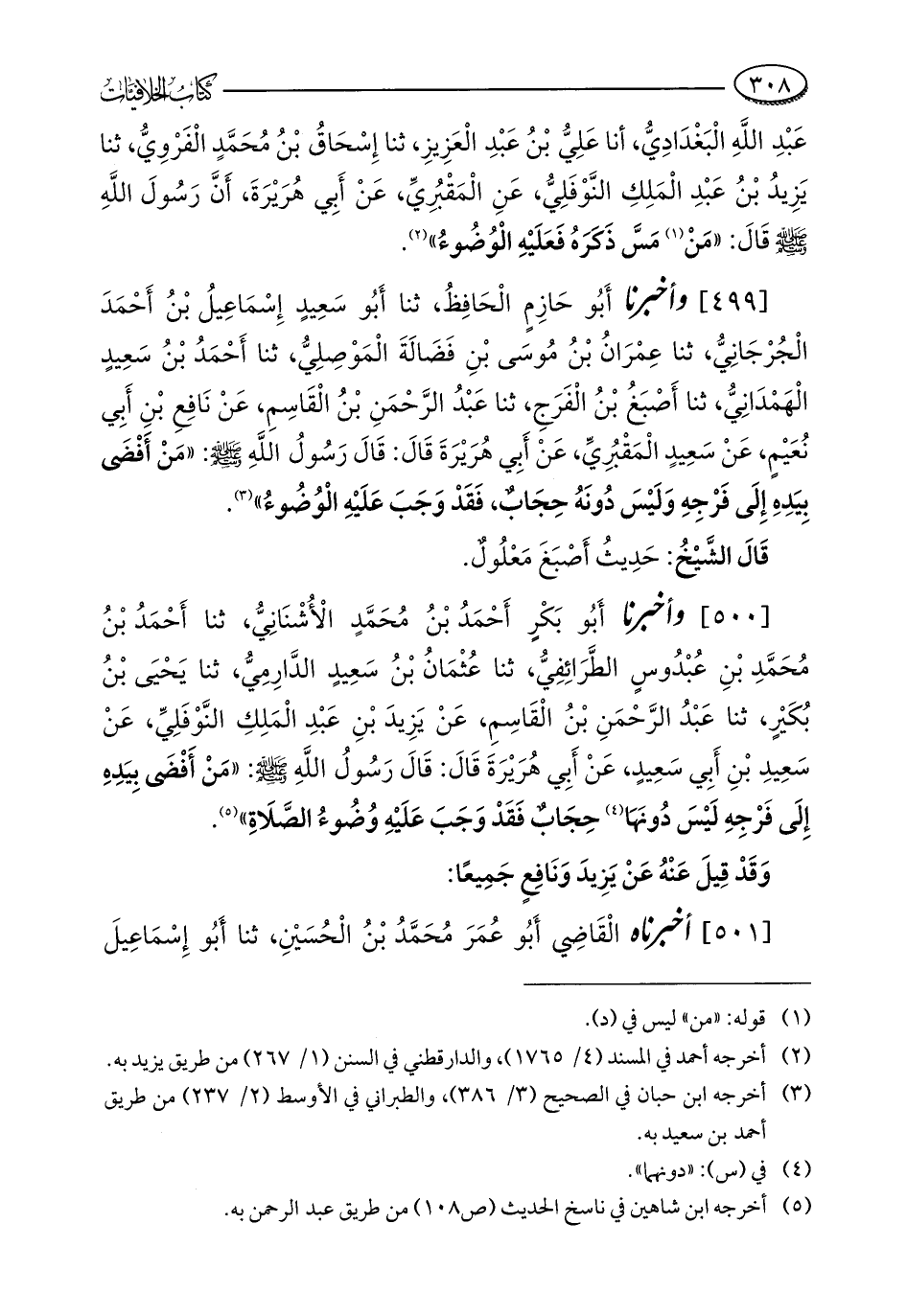 [499] وأخبرنا أَبُو حَازِمٍ الْحَافِظُ، ثنا أَبُو سَعِيدٍ إِسْمَاعِيلُ بْنُ أَحْمَدَ الْجُرْجَانِيُّ، ثنا عِمْرَانُ بْنُ مُوسَى بْنِ فَضَالَةَ الْمَوْصِلِيُّ، ثنا أَحْمَدُ بْنُ سَعِيدٍ الْهَمْدَانِيُّ، ثنا أَصْبَغُ بْنُ الْفَرَجِ، ثنا عَبْدُ الرَّحْمَنِ بْنُ الْقَاسِمِ، عَنْ نَافِعِ بْنِ أَبِي نُعَيْمٍ، عَنْ سَعِيدٍ الْمَقْبُرِيِّ، عَنْ أَبِي هُرَيْرَةَ قَالَ: قَالَ رَسُولُ اللَّهِ - صلى الله عليه وسلم -: "مَنْ أَفْضَى بِيَدِهِ إِلَى فَرْجِهِ وَلَيْسَ دُونَهُ حِجَابٌ، فَقَدْ وَجَبَ عَلَيْهِ الْوُضُوءُ" (¬3).