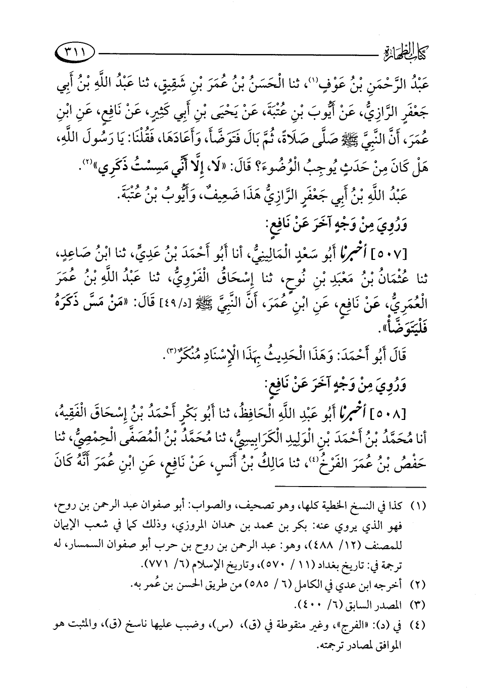 [507] أخبرنا أَبُو سَعْدٍ الْمَالِينِيُّ، أنا أَبُو أَحْمَدَ بْنُ عَدِيٍّ، ثنا ابْنُ صَاعِدٍ، ثنا عُثْمَانُ بْنُ مَعْبَدِ بْنِ نُوحٍ، ثنا إِسْحَاقُ الْفَرْوِيُّ، ثنا عَبْدُ اللَّهِ بْنُ عُمَرَ الْعُمَرِيُّ، عَنْ نَافِعٍ، عَنِ ابْنِ عُمَرَ، أَنَّ النَّبِيَّ - صلى الله عليه وسلم - قَالَ: "مَنْ مَسَّ ذَكَرَهُ فَلْيَتَوَضَّأْ".
