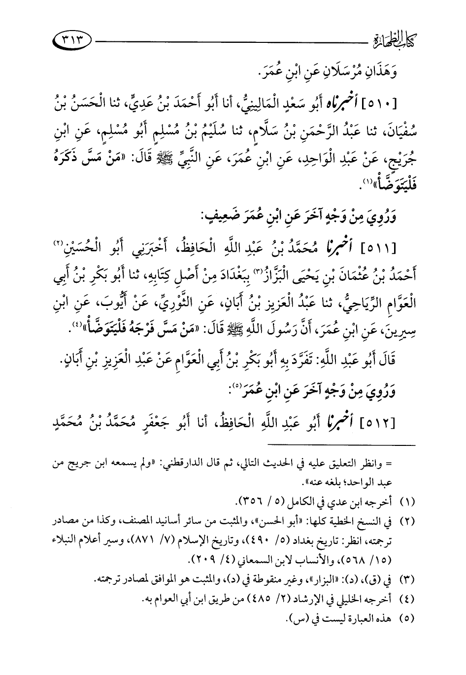 [510] أخبرناه أَبُو سَعْدٍ الْمَالِينِيُّ، أنا أَبُو أَحْمَدَ بْنُ عَدِيٍّ، ثنا الْحَسَنُ بْنُ سُفْيَانَ، ثنا عَبْدُ الرَّحْمَنِ بْنُ سَلَّامٍ، ثنا سُلَيْمُ بْنُ مُسْلِمٍ أَبُو مُسْلِمٍ، عَنِ ابْنِ جُرَيْجٍ، عَنْ عَبْدِ الْوَاحِدِ، عَنِ ابْنِ عُمَرَ، عَنِ النَّبِيِّ - صلى الله عليه وسلم - قَالَ: "مَنْ مَسَّ ذَكَرَهُ فَلْيَتَوَضَّأْ" (¬1).