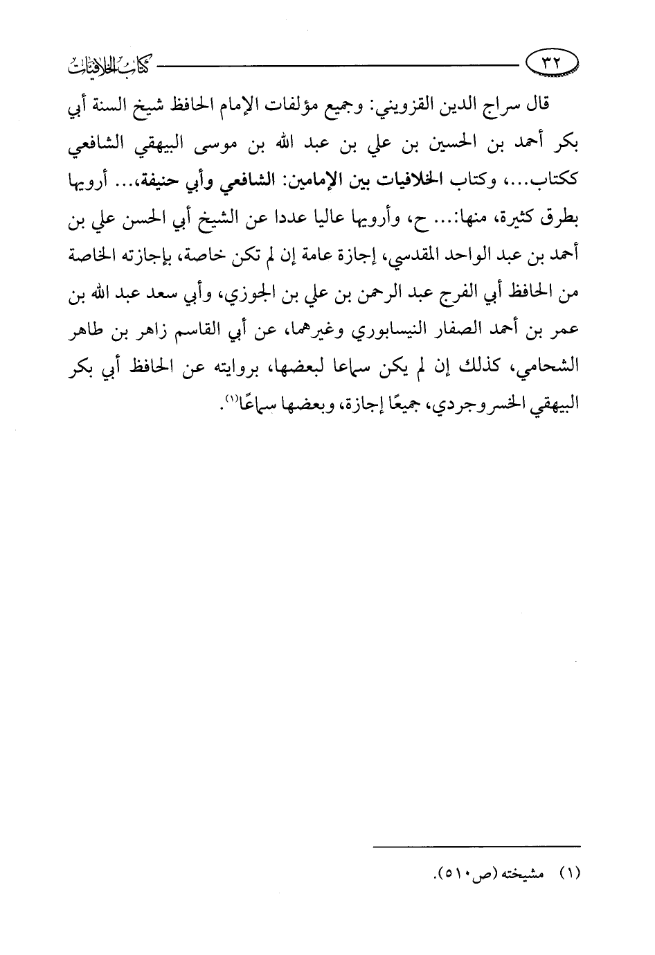 قال سراج الدين القزويني: وجميع مؤلفات الإمام الحافظ شيخ السنة أبي بكر أحمد بن الحسين بن علي بن عبد الله بن موسى البيهقي الشافعي ككتاب. . .، وكتاب الخلافيات بين الإمامين: الشافعي وأبي حنيفة، . . . أرويها بطرق كثيرة، منها: . . . ح، وأرويها عاليا عددا عن الشيخ أبي الحسن علي بن أحمد بن عبد الواحد المقدسي، إجازة عامة إن لم تكن خاصة، بإجازته الخاصة من الحافظ أبي الفرج عبد الرحمن بن علي بن الجوزي، وأبي سعد عبد الله بن عمر بن أحمد الصفار النيسابوري وغيرهما، عن أبي القاسم زاهر بن طاهر الشحامي، كذلك إن لم يكن سماعا لبعضها، بروايته عن الحافظ أبي بكر البيهقي الخسروجردي، جميعًا إجازة، وبعضها سماعًا (¬1).