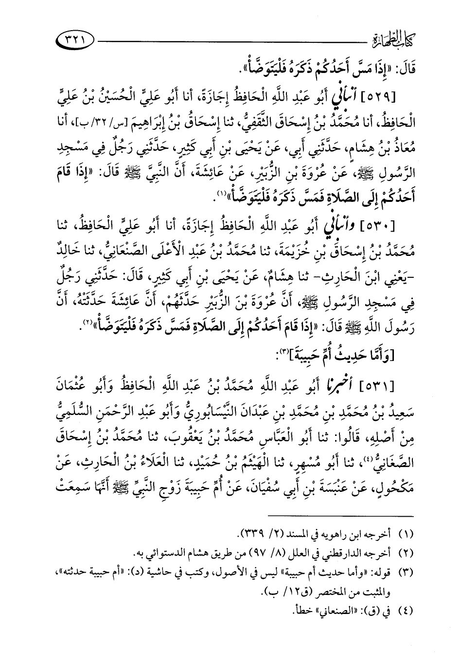 [530] وأنبأني أَبُو عَبْدِ اللَّهِ الْحَافِظُ إِجَازَةً، أنا أَبُو عَلِيٍّ الْحَافِظُ، ثنا مُحَمَّدُ بْنُ إِسْحَاقَ بْنِ خُزَيْمَةَ، ثنا مُحَمَّدُ بْنُ عَبْدِ الْأَعْلَى الصَّنْعَانِيُّ، ثنا خَالِدٌ - يَعْنِي ابْنَ الْحَارِثِ - ثنا هِشَامٌ، عَنْ يَحْيَى بْنِ أَبِي كَثِيرٍ، قَالَ: حَدَّثَنِي رَجُلٌ فِي مَسْجِدِ الرَّسُولِ - صلى الله عليه وسلم -، أَنَّ عُرْوَةَ بْنَ الزُّبَيْرِ حَدَّثَهُمْ، أَنَّ عَائِشَةَ حَدَّثَتْهُ، أَنَّ رَسُولَ اللَّهِ - صلى الله عليه وسلم - قَالَ: "إِذَا قَامَ أَحَدُكُمْ إِلَى الصَّلَاةِ فَمَسَّ ذَكَرَهُ فَلْيَتَوَضَّأْ" (¬2).