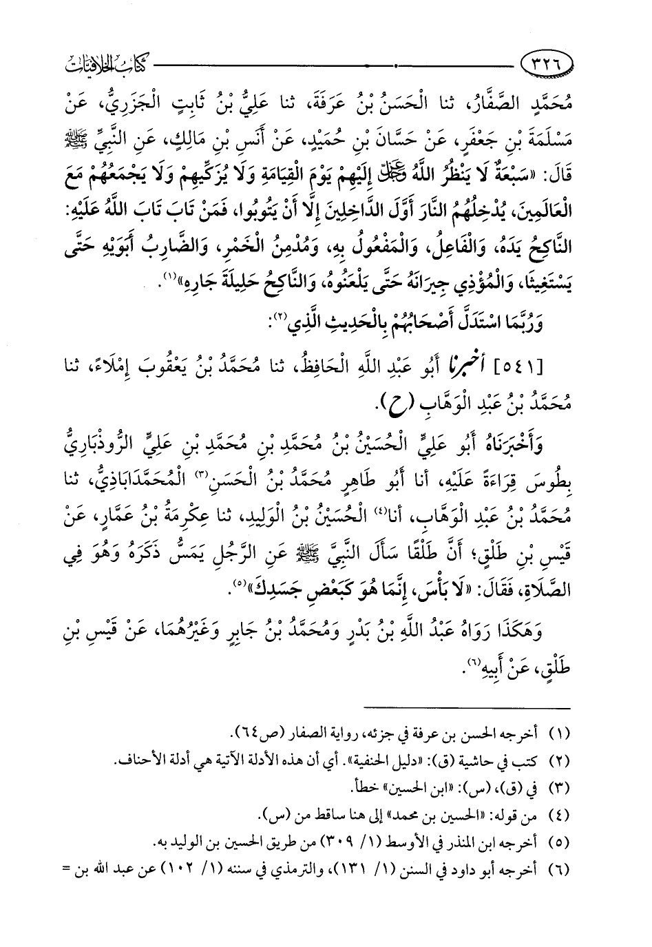 وَأَخْبَرَنَاهُ أَبُو عَلِيٍّ الْحُسَيْنُ بْنُ مُحَمَّدِ بْنِ مُحَمَّدِ بْنِ عَلِيٍّ الرُّوذْبَارِيُّ بِطُوسَ قِرَاءَةً عَلَيْهِ، أنا أَبُو طَاهِرٍ مُحَمَّدُ بْنُ الْحَسَنِ (¬3) الْمُحَمَّدَابَاذِيُّ، ثنا مُحَمَّدُ بْنُ عَبْدِ الْوَهَّابِ، أنا (¬4) الْحُسَيْنُ بْنُ الْوَلِيدِ، ثنا عِكْرِمَةُ بْنُ عَمَّارٍ، عَنْ قَيْسِ بْنِ طَلْقٍ؛ أَنَّ طَلْقًا سَأَلَ النَّبِيَّ - صلى الله عليه وسلم - عَنِ الرَّجُلِ يَمَسُّ ذَكَرَهُ وَهُوَ فِي الصَّلَاةِ، فَقَالَ: "لَا بَأْسَ، إِنَّمَا هُوَ كَبَعْضِ جَسَدِكَ" (¬5).