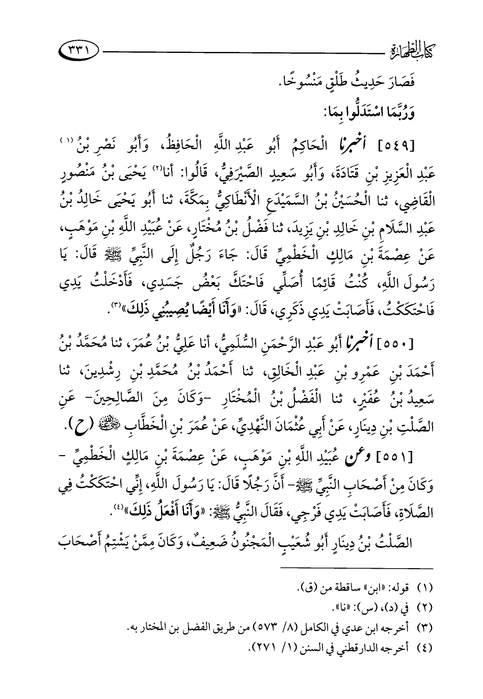 [549] أخبرنا الْحَاكِمُ أَبُو عَبْدِ اللَّهِ الْحَافِظُ، وَأَبُو نَصْرِ بْنُ (¬1) عَبْدِ الْعَزِيزِ بْنِ قَتَادَةَ، وَأَبُو سَعِيدٍ الصَّيْرَفِيُّ، قَالُوا: أنا (¬2) يَحْيَى بْنُ مَنْصُورٍ الْقَاضِي، ثنا الْحُسَيْنُ بْنُ السَّمَيْدَعِ الْأَنْطَاكِيُّ بِمَكَّةَ، ثنا أَبُو يَحْيَى خَالِدُ بْنُ عَبْدِ السَّلَامِ بْنِ خَالِدِ بْنِ يَزِيدَ، ثنا فَضْلُ بْنُ مُخْتَارٍ، عَنْ عُبَيْدِ اللَّهِ بْنِ مَوْهَبٍ، عَنْ عِصْمَةَ بْنِ مَالِكٍ الْخَطْمِيِّ قَالَ: جَاءَ رَجُلٌ إِلَى النَّبِيِّ - صلى الله عليه وسلم - قَالَ: يَا رَسُولَ اللَّهِ، كُنْتُ قَائِمًا أُصَلِّي فَاحْتَكَّ بَعْضُ جَسَدِي، فَأَدْخَلْتُ يَدِي فَاحْتكَكْتُ، فَأَصَابَتْ يَدِي ذَكَرِي، قَالَ: "وَأَنَا أَيْضًا يُصِيبُنِي ذَلِكَ" (¬3).