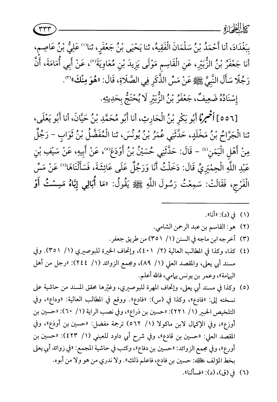 [556] أخبرنا أَبُو بَكْرِ بْنُ الْحَارِثِ، أنا أَبُو مُحَمَّدِ بْنُ حَيَّانَ، أنا أَبُو يَعْلَى، ثنا الْجَرَّاحُ بْنُ مَخْلَدٍ، حَدَّثَنِي عُمَرُ بْنُ يُونُسَ، ثنا الْمُفَضَّلُ بْنُ ثَوَابٍ - رَجُلٌ مِنْ أَهْلِ الْيَمَنِ (¬4) - قَالَ: حَدَّثَنِي حُسَيْنُ بْنُ أَوْدَعَ (¬5)، عَنْ أَبِيهِ، عَنْ سَيْفِ بْنِ عَبْدِ اللَّهِ الْحِمْيَرِيِّ قَالَ: دَخَلْتُ أَنَا وَرَجُلٌ عَلَى عَائِشَةَ، فَسَأَلْنَاهَا (¬6) عَنْ مَسِّ الْفَرْجِ، فَقَالَتْ: سَمِعْتُ رَسُولَ اللَّهِ - صلى الله عليه وسلم - يَقُولُ: "مَا أُبَالِي إِيَّاهُ مَسِسْتُ أَوْ