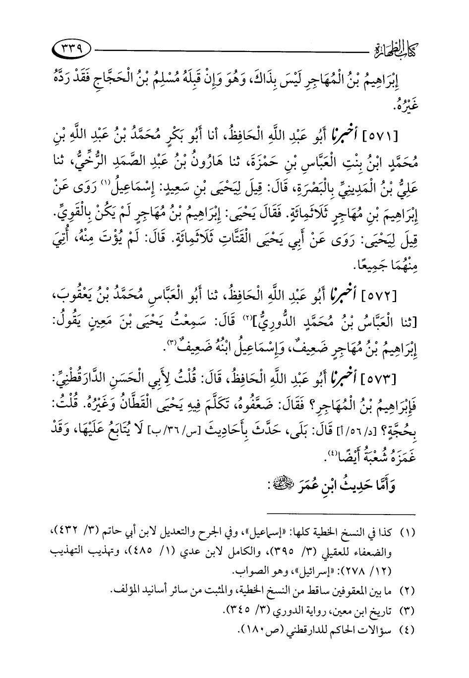[572] أخبرنا أَبُو عَبْدِ اللَّهِ الْحَافِظُ، ثنا أَبُو الْعَبَّاسِ مُحَمَّدُ بْنُ يَعْقُوبَ، [ثنا الْعَبَّاسُ بْنُ مُحَمَّدٍ الدُّورِيُّ] (¬2) قَالَ: سَمِعْتُ يَحْيَى بْنَ مَعِينٍ يَقُولُ: إِبْرَاهِيمُ بْنُ مُهَاجِرٍ ضَعِيفٌ، وَإِسْمَاعِيلُ ابْنُهُ ضَعِيفٌ (¬3).