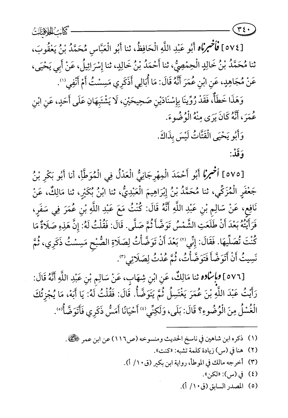 [575] أخبرنا أَبُو أَحْمَدَ الْمِهْرِجَانِيُّ الْعَدْلُ فِي الْمُوَطَّأِ، أنا أَبُو بَكْرِ بْنُ جَعْفَرٍ الْمُزَكِّي، ثنا مُحَمَّدُ بْنُ إِبْرَاهِيمَ الْعَبْدِيُّ، ثنا ابْنُ بُكَيْرٍ، ثنا مَالِكٌ، عَنْ نَافِعٍ، عَنْ سَالِمِ بْنِ عَبْدِ اللَّهِ أَنَّهُ قَالَ: كُنْتُ مَعَ عَبْدِ اللَّهِ بْنِ عُمَرَ فِي سَفَرٍ، فَرَأَيْتُهُ بَعْدَ أَنْ طَلَعَتِ الشَّمْسُ تَوَضَّأَ ثُمَّ صَلَّى. قَالَ: فَقُلْتُ لَهُ: إِنَّ هَذِهِ صَلَاةٌ مَا كُنْتَ تُصَلِّيهَا. فَقَالَ: إِنِّي (¬2) بَعْدَ أَنْ تَوَضَّأْتُ لِصَلَاةِ الصُّبْحِ مَسِسْتُ ذَكَرِي، ثُمَّ نَسِيتُ أَنْ أَتَوَضَّأَ فَتَوَضَّأْتُ، ثُمَّ عُدْتُ لِصَلَاتِي (¬3).