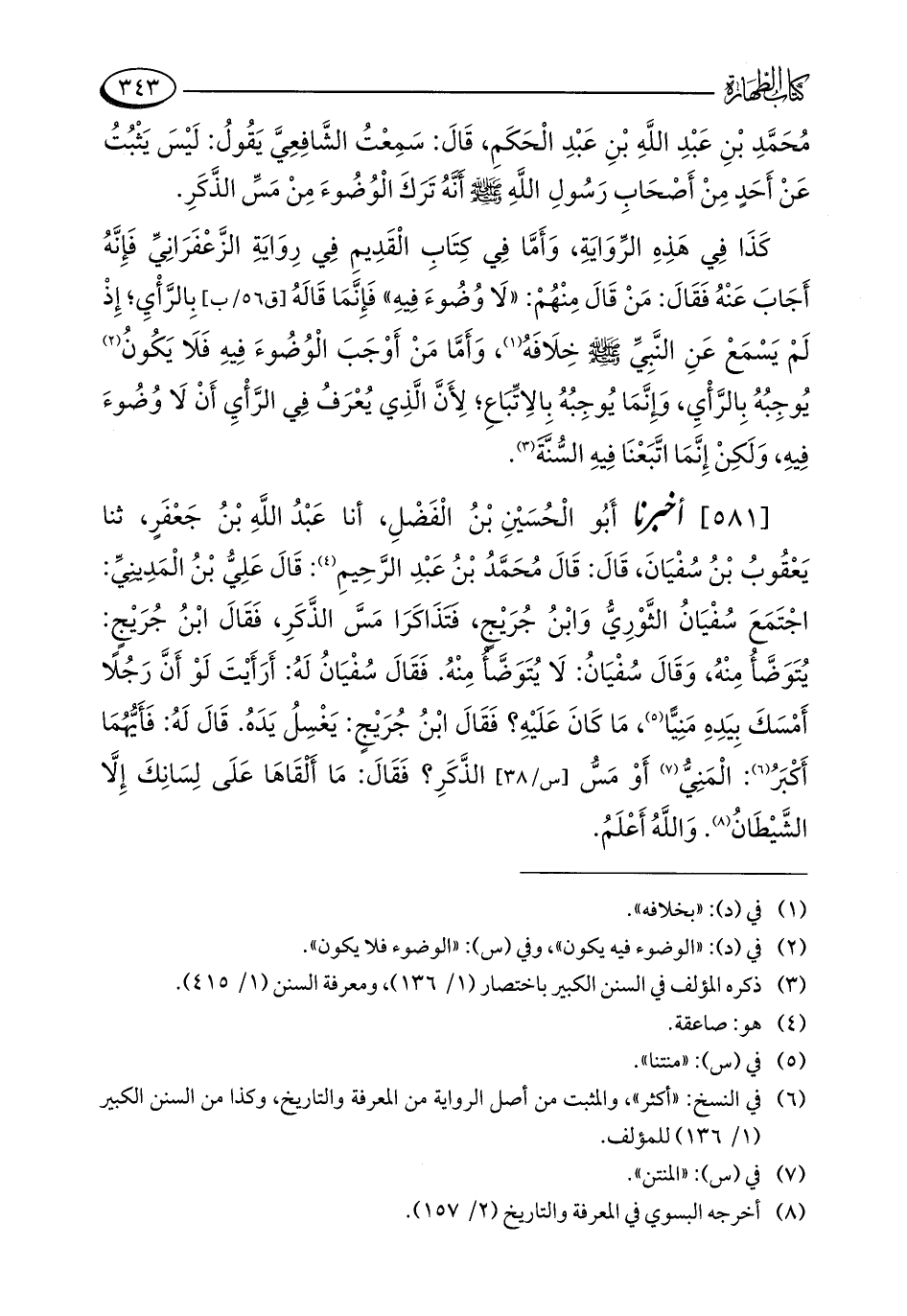 [581] أخبرنا أَبُو الْحُسَيْنِ بْنُ الْفَضْلِ، أنا عَبْدُ اللَّهِ بْنُ جَعْفَرٍ، ثنا يَعْقُوبُ بْنُ سُفْيَانَ، قَالَ: قَالَ مُحَمَّدُ بْنُ عَبْدِ الرَّحِيمِ (¬4): قَالَ عَلِيُّ بْنُ الْمَدِينِيِّ: اجْتَمَعَ سُفْيَانُ الثَّوْرِيُّ وَابْنُ جُرَيْجٍ، فَتَذَاكَرَا مَسَّ الذَّكَرِ، فَقَالَ ابْنُ جُرَيْجٍ: يُتَوَضَّأُ مِنْهُ، وَقَالَ سُفْيَانُ: لَا يُتَوَضَّأُ مِنْهُ. فَقَالَ سُفْيَانُ لَهُ: أَرَأَيْتَ لَوْ أَنَّ رَجُلًا أَمْسَكَ بِيَدِهِ مَنِيًّا (¬5)، مَا كَانَ عَلَيْهِ؟ فَقَالَ ابْنُ جُرَيْجٍ: يَغْسِلُ يَدَهُ. قَالَ لَهُ: فَأَيُّهُمَا أَكْبَرُ (¬6): الْمَنِيُّ (¬7) أَوْ مَسُّ الذَّكَرِ؟ فَقَالَ: مَا أَلْقَاهَا عَلَى لِسَانِكَ إِلَّا الشَّيْطَانُ (¬8). وَاللَّهُ أَعْلَمُ.