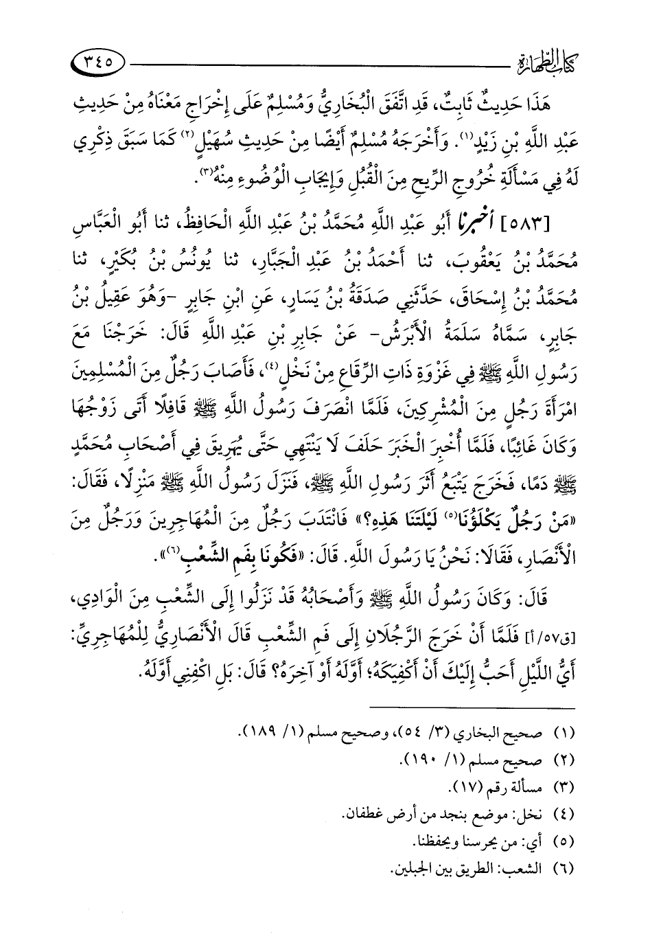 [583] أخبرنا أَبُو عَبْدِ اللَّهِ مُحَمَّدُ بْنُ عَبْدِ اللَّهِ الْحَافِظُ، ثنا أَبُو الْعَبَّاسِ مُحَمَّدُ بْنُ يَعْقُوبَ، ثنا أَحْمَدُ بْنُ عَبْدِ الْجَبَّارِ، ثنا يُونُسُ بْنُ بُكَيْرٍ، ثنا مُحَمَّدُ بْنُ إِسْحَاقَ، حَدَّثَنِي صَدَقَةُ بْنُ يَسَارٍ، عَنِ ابْنِ جَابِرٍ - وَهُوَ عَقِيلُ بْنُ جَابِرٍ، سَمَّاهُ سَلَمَةُ الْأَبْرَشُ - عَنْ جَابِرِ بْنِ عَبْدِ اللَّهِ قَالَ: خَرَجْنَا مَعَ رَسُولِ اللَّهِ - صلى الله عليه وسلم - فِي غَزْوَةِ ذَاتِ الرِّقَاعِ مِنْ نَخْلٍ (¬4)، فَأَصَابَ رَجُلٌ مِنَ الْمُسْلِمِينَ امْرَأَةَ رَجُلٍ مِنَ الْمُشْرِكِينَ، فَلَمَّا انْصَرَفَ رَسُولُ اللَّهِ - صلى الله عليه وسلم - قَافِلًا أَتَى زَوْجُهَا وَكَانَ غَائِبًا، فَلَمَّا أُخْبِرَ الْخَبَرَ حَلَفَ لَا يَنْتَهِي حَتَّى يُهَرِيقَ فِي أَصْحَابِ مُحَمَّدٍ - صلى الله عليه وسلم - دَمًا، فَخَرَجَ يَتْبَعُ أَثَرَ رَسُولِ اللَّهِ - صلى الله عليه وسلم -، فَنَزَلَ رَسُولُ اللَّهِ - صلى الله عليه وسلم - مَنْزِلًا، فَقَالَ: "مَنْ رَجُلٌ يَكْلَؤُنَا (¬5) لَيْلَتَنَا هَذِهِ؟ " فَانْتَدَبَ رَجُلٌ مِنَ الْمُهَاجِرِينَ وَرَجُلٌ مِنَ الْأَنْصَارِ، فَقَالَا: نَحْنُ يَا رَسُولَ اللَّهِ. قَالَ: "فَكُونَا بِفَمِ الشِّعْبِ (¬6) ".