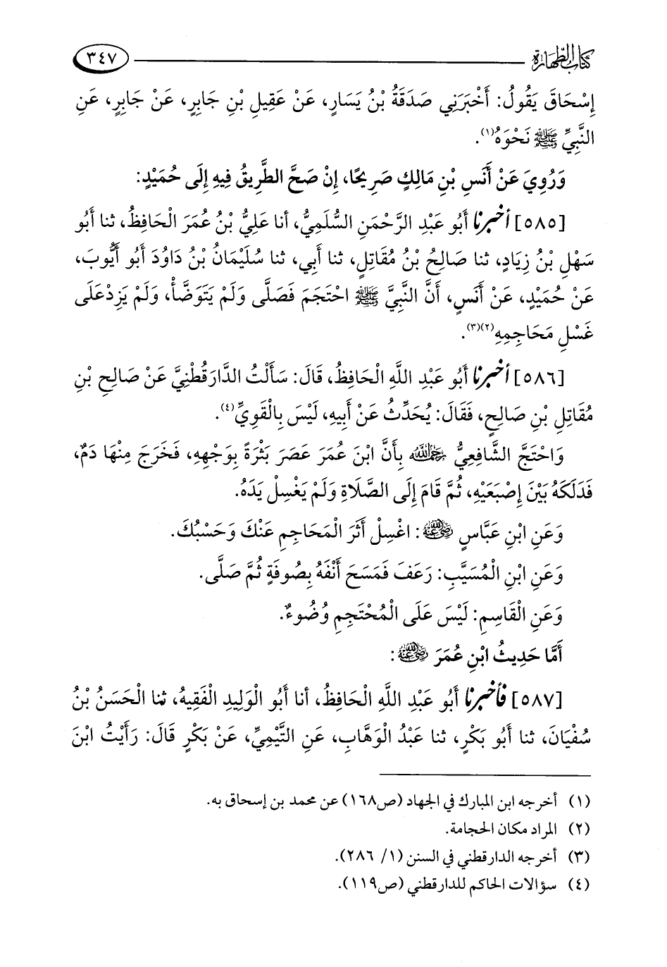 [585] أخبرنا أَبُو عَبْدِ الرَّحْمَنِ السُّلَمِيُّ، أنا عَلِيُّ بْنُ عُمَرَ الْحَافِظُ، ثنا أَبُو سَهْلِ بْنُ زِيَادٍ، ثنا صَالِحُ بْنُ مُقَاتِلٍ، ثنا أَبِي، ثنا سُلَيْمَانُ بْنُ دَاوُدَ أَبُو أَيُّوبَ، عَنْ حُمَيْدٍ، عَنْ أَنَسٍ، أَنَّ النَّبِيَّ - صلى الله عليه وسلم - احْتَجَمَ فَصَلَّى وَلَمْ يَتَوَضَّأْ، وَلَمْ يَزِدْ عَلَى غَسْلِ مَحَاجِمِهِ (¬2) (¬3).