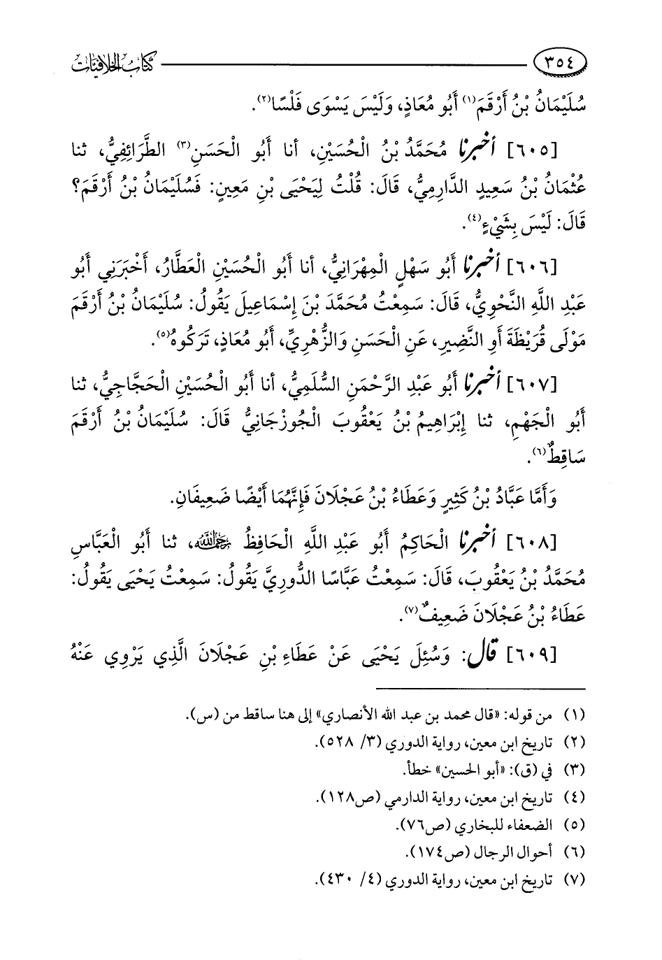 [605] أخبرنا مُحَمَّدُ بْنُ الْحُسَيْنِ، أنا أَبُو الْحَسَنِ (¬3) الطَّرَائِفِيُّ، ثنا عُثْمَانُ بْنُ سَعِيدٍ الدَّارِمِيُّ، قَالَ: قُلْتُ لِيَحْيَى بْنِ مَعِينٍ: فَسُلَيْمَانُ بْنُ أَرْقَمَ؟ قَالَ: لَيْسَ بِشَيْءٍ (¬4).