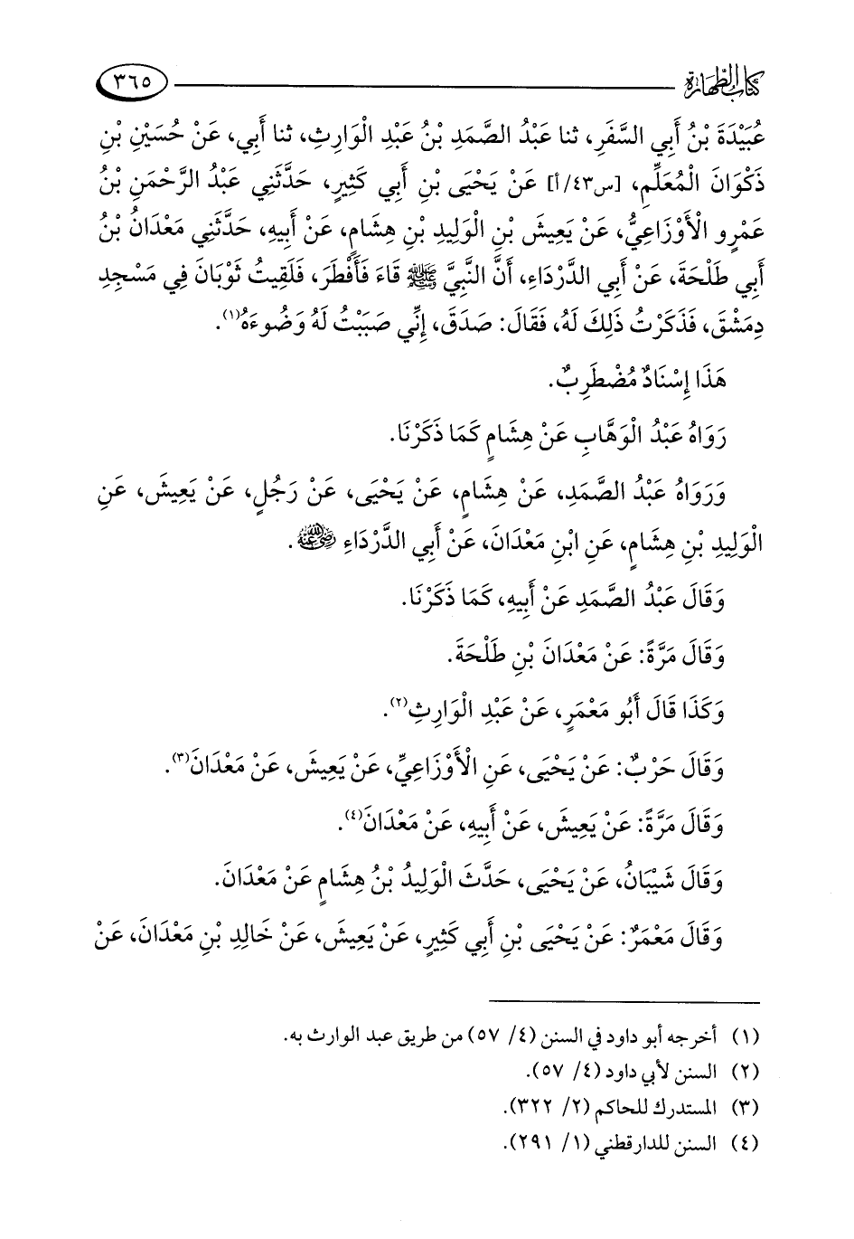 عُبَيْدَةَ بْنُ أَبِي السَّفَرِ، ثنا عَبْدُ الصَّمَدِ بْنُ عَبْدِ الْوَارِثِ، ثنا أَبِي، عَنْ حُسَيْنِ بْنِ ذَكْوَانَ الْمُعَلِّمِ، عَنْ يَحْيَى بْنِ أَبِي كَثِيرٍ، حَدَّثَنِي عَبْدُ الرَّحْمَنِ بْنُ عَمْرٍو الْأَوْزَاعِيُّ، عَنْ يَعِيشَ بْنِ الْوَلِيدِ بْنِ هِشَامٍ، عَنْ أَبِيهِ، حَدَّثَنِي مَعْدَانُ بْنُ أَبِي طَلْحَةَ، عَنْ أَبِي الدَّرْدَاءِ، أَنَّ النَّبِيَّ - صلى الله عليه وسلم - قاءَ فَأَفْطَرَ، فَلَقِيتُ ثَوْبَانَ في مَسْجِدِ دِمَشْقَ، فَذَكَرْتُ ذَلِكَ لَهُ، فَقَالَ: صَدَقَ، إِنِّي صَبَبْتُ لَهُ وَضُوءَهُ (¬1).