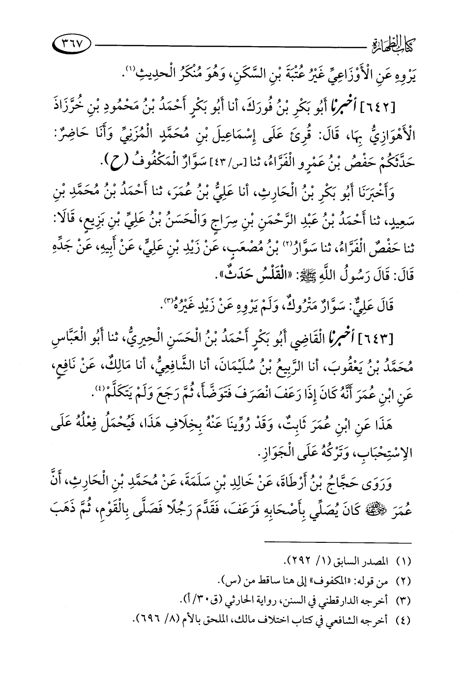 [643] أخبرنا الْقَاضِي أَبُو بَكْرٍ أَحْمَدُ بْنُ الْحَسَنِ الْحِيرِيُّ، ثنا أَبُو الْعَبَّاسِ مُحَمَّدُ بْنُ يَعْقُوبَ، أنا الرَّبِيعُ بْنُ سُلَيْمَانَ، أنا الشَّافِعِيُّ، أنا مَالِكٌ، عَنْ نَافِعٍ، عَنِ ابْنِ عُمَرَ أَنَّهُ كَانَ إِذَا رَعَفَ انْصَرَفَ فَتَوَضَّأَ، ثُمَّ رَجَعَ وَلَمْ يَتَكَلَّمْ (¬4).