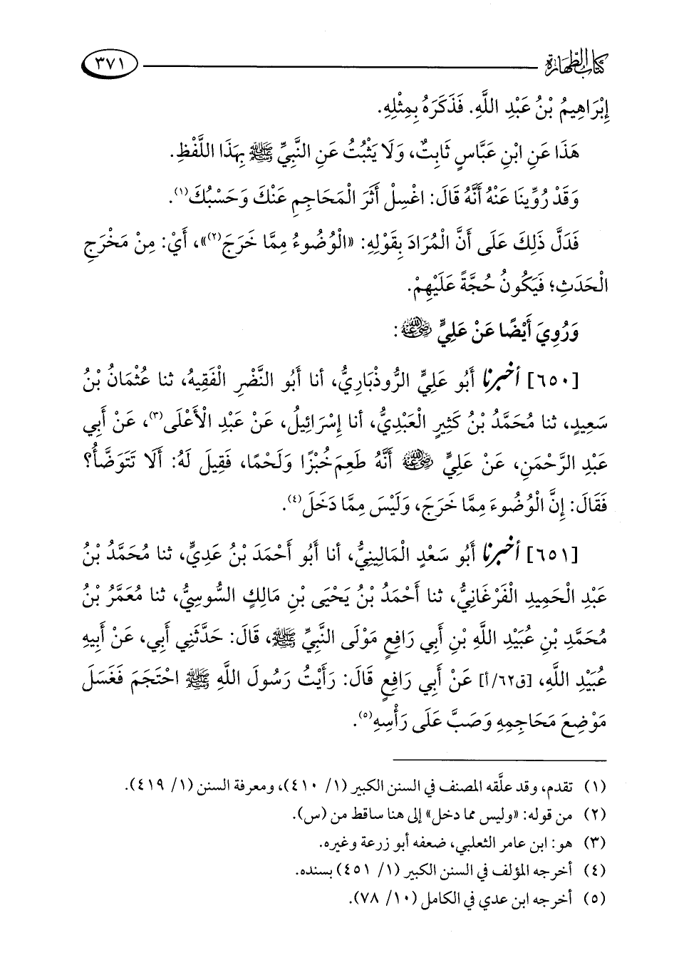 [650] أخبرنا أَبُو عَلِيٍّ الرُّوذْبَارِيُّ، أنا أَبُو النَّضْرِ الْفَقِيهُ، ثنا عُثْمَانُ بْنُ سَعِيدٍ، ثنا مُحَمَّدُ بْنُ كَثِيرٍ الْعَبْدِيُّ، أنا إِسْرَائِيلُ، عَنْ عَبْدِ الْأَعْلَى (¬3)، عَنْ أَبِي عَبْدِ الرَّحْمَنِ، عَنْ عَلِيٍّ - رضي الله عنه - أَنَّهُ طَعِمَ خُبْزًا وَلَحْمًا، فَقِيلَ لَهُ: أَلَا تَتَوَضَّأُ؟ فَقَالَ: إِنَّ الْوُضُوءَ مِمَّا خَرَجَ، وَلَيْسَ مِمَّا دَخَلَ (¬4).
