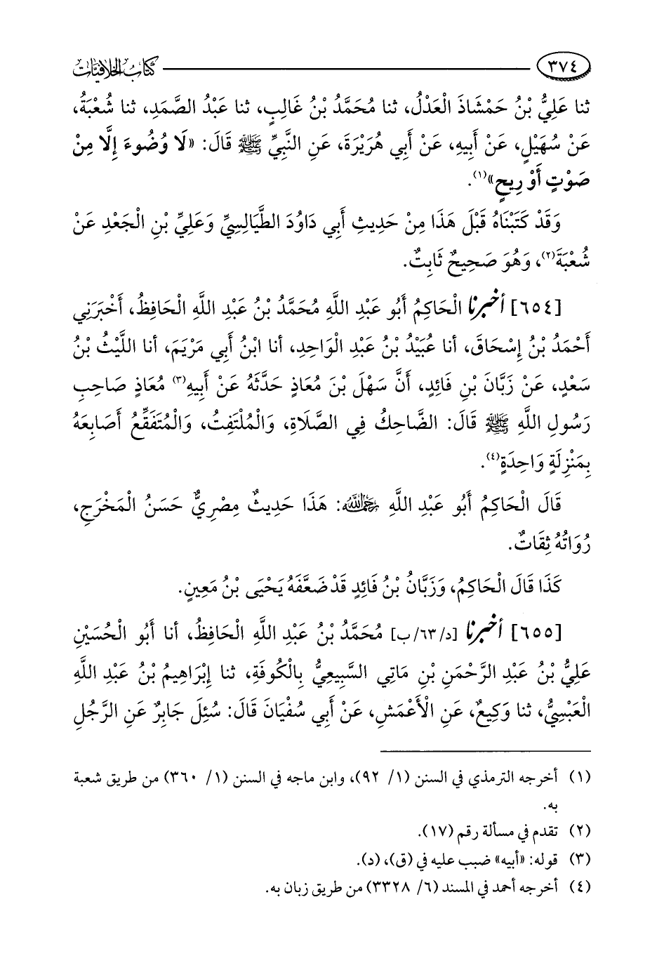 [654] أخبرنا الْحَاكِمُ أَبُو عَبْدِ اللَّهِ مُحَمَّدُ بْنُ عَبْدِ اللَّهِ الْحَافِظُ، أَخْبَرَنِي أَحْمَدُ بْنُ إِسْحَاقَ، أنا عُبَيْدُ بْنُ عَبْدِ الْوَاحِدِ، أنا ابْنُ أَبِي مَرْيَمَ، أنا اللَّيْثُ بْنُ سَعْدٍ، عَنْ زَبَّانَ بْنِ فَائِدٍ، أَنَّ سَهْلَ بْنَ مُعَاذٍ حَدَّثَهُ عَنْ أَبِيهِ (¬3) مُعَاذٍ صَاحِبِ رَسُولِ اللَّهِ - صلى الله عليه وسلم - قَالَ: الضَّاحِكُ فِي الصَّلَاةِ، وَالْمُلْتَفِتُ، وَالْمُتَفَقِّعُ أَصَابِعَهُ بِمَنْزِلَةٍ وَاحِدَةٍ (¬4).