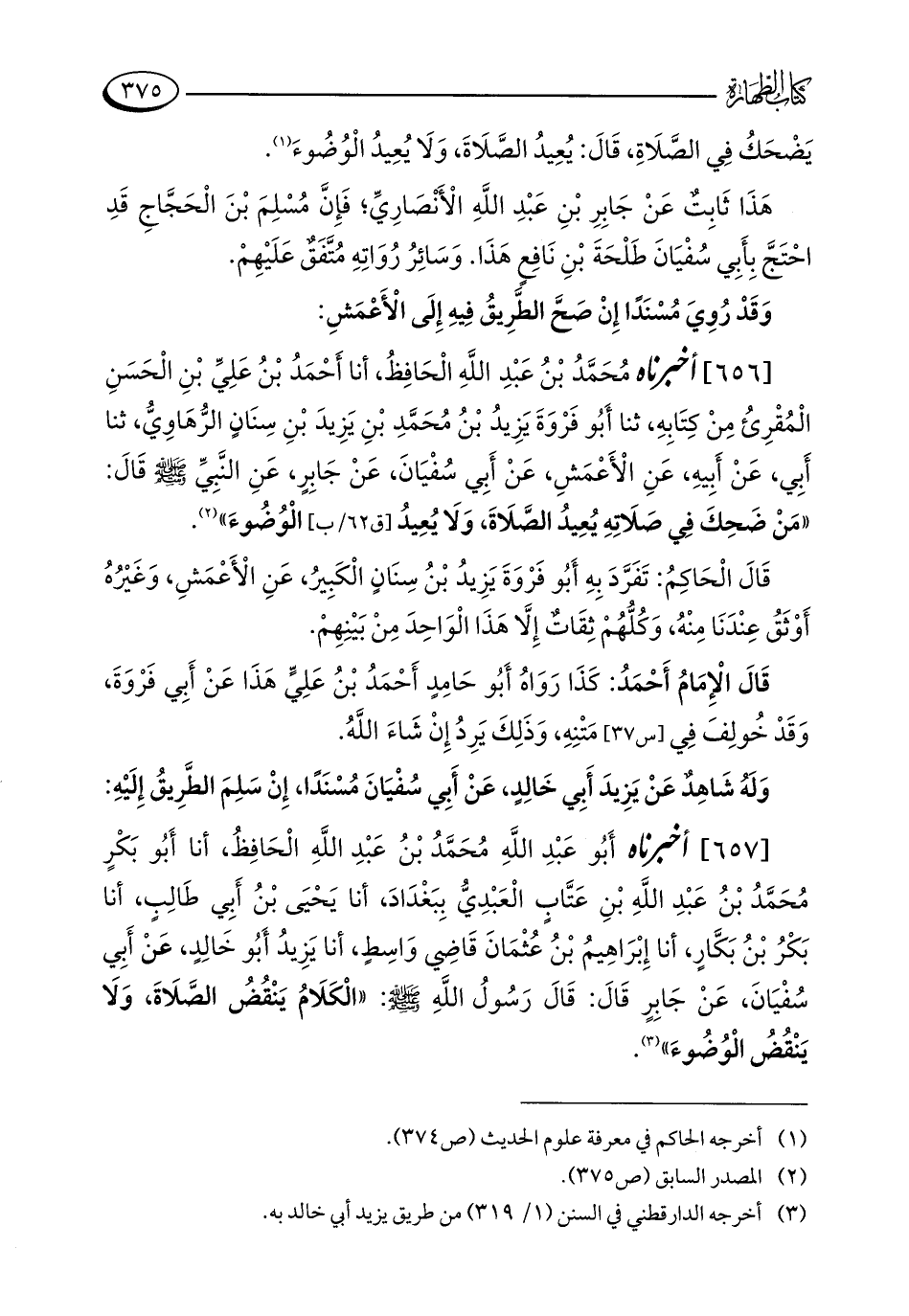 [657] أخبرناه أَبُو عَبْدِ اللَّهِ مُحَمَّدُ بْنُ عَبْدِ اللَّهِ الْحَافِظُ، أنا أَبُو بَكْرٍ مُحَمَّدُ بْنُ عَبْدِ اللَّهِ بْنِ عَتَّابٍ الْعَبْدِيُّ بِبَغْدَادَ، أنا يَحْيَى بْنُ أَبِي طَالِبٍ، أنا بَكْرُ بْنُ بَكَّارٍ، أنا إِبْرَاهِيمُ بْنُ عُثْمَانَ قَاضِي وَاسِطٍ، أنا يَزِيدُ أَبُو خَالِدٍ، عَنْ أَبِي سُفْيَانَ، عَنْ جَابِرٍ قَالَ: قَالَ رَسُولُ اللَّهِ - صلى الله عليه وسلم -: "الْكَلَامُ يَنْقُضُ الصَّلَاةَ، وَلَا يَنْقُضُ الْوُضُوءَ" (¬3).