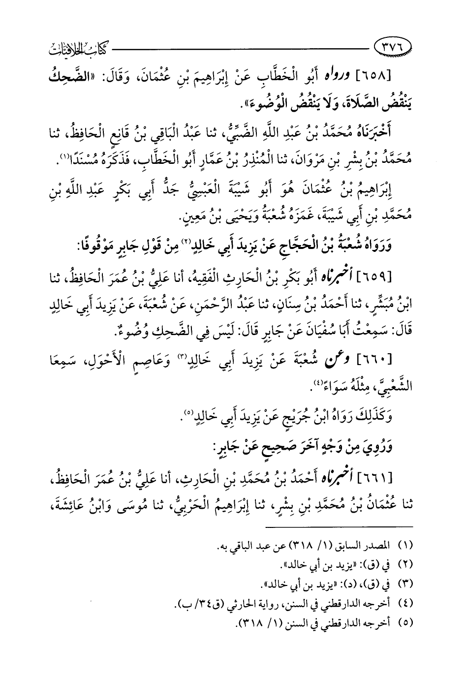 [659] أخبرناه أَبُو بَكْرِ بْنُ الْحَارِثِ الْفَقِيهُ، أنا عَلِيُّ بْنُ عُمَرَ الْحَافِظُ، ثنا ابْنُ مُبَشِّرٍ، ثنا أَحْمَدُ بْنُ سِنَانٍ، ثنا عَبْدُ الرَّحْمَنِ، عَنْ شُعْبَةَ، عَنْ يَزِيدَ أَبِي خَالِدٍ قَالَ: سَمِعْتُ أَبَا سُفْيَانَ عَنْ جَابِرٍ قَالَ: لَيْسَ في الضَّحِكِ وُضُوءٌ.