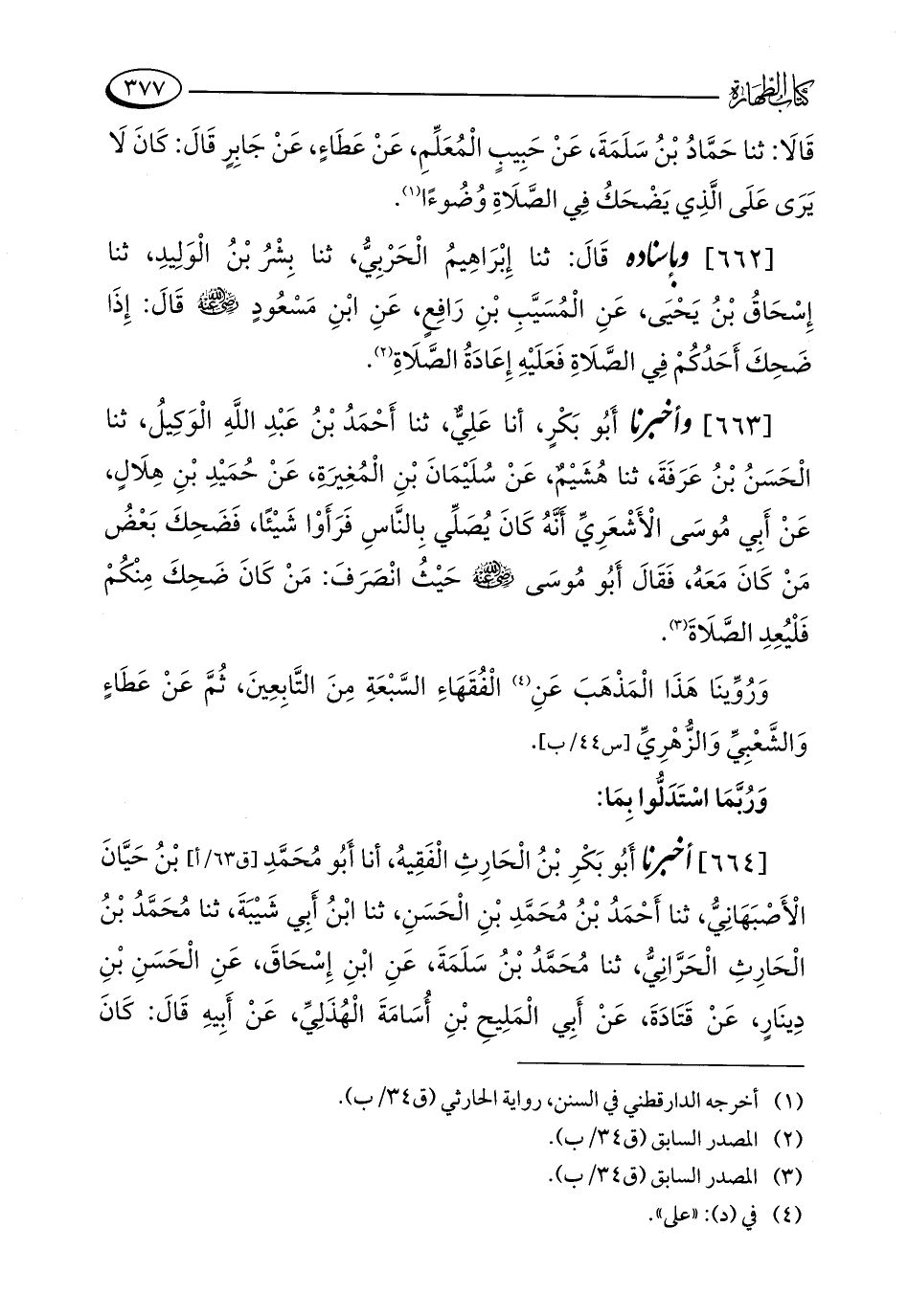 [663] وأخبرنا أَبُو بَكْرٍ، أنا عَلِيٌّ، ثنا أَحْمَدُ بْنُ عَبْدِ اللَّهِ الْوَكِيلُ، ثنا الْحَسَنُ بْنُ عَرَفَةَ، ثنا هُشَيْمٌ، عَنْ سُلَيْمَانَ بْنِ الْمُغِيرَةِ، عَنْ حُمَيْدِ بْنِ هِلَالٍ، عَنْ أَبِي مُوسَى الْأَشْعَرِيِّ أَنَّهُ كَانَ يُصَلِّي بِالنَّاسِ فَرَأَوْا شَيْئًا، فَضَحِكَ بَعْضُ مَنْ كَانَ مَعَهُ، فَقَالَ أَبُو مُوسَى - رضي الله عنه - حَيْثُ انْصَرَفَ: مَنْ كَانَ ضَحِكَ مِنْكُمْ فَلْيُعِدِ الصَّلَاةَ (¬3).