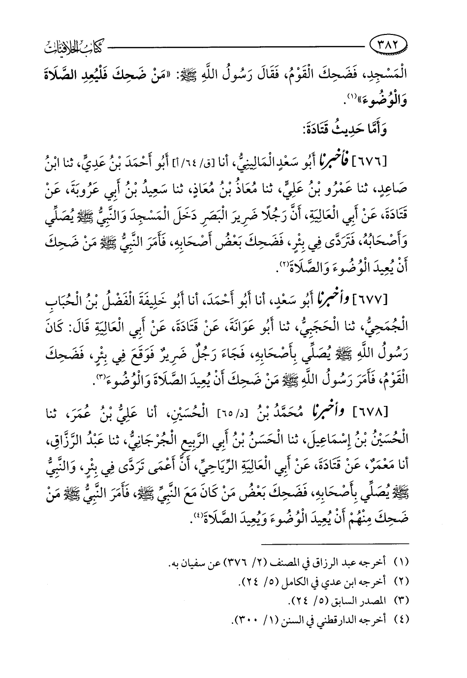 [676] فأخبرنا أَبُو سَعْدٍ الْمَالِينِيُّ، أنا أَبُو أَحْمَدَ بْنُ عَدِيٍّ، ثنا ابْنُ صَاعِدٍ، ثنا عَمْرُو بْنُ عَلِيٍّ، ثنا مُعَاذُ بْنُ مُعَاذٍ، ثنا سَعِيدُ بْنُ أَبِي عَرُوبَةَ، عَنْ قَتَادَةَ، عَنْ أَبِي الْعَالِيَةِ، أَنَّ رَجُلًا ضَرِيرَ الْبَصَرِ دَخَلَ الْمَسْجِدَ وَالنَّبِيُّ - صلى الله عليه وسلم - يُصَلِّي وَأَصْحَابُهُ، فَتَرَدَّى فِي بِئْرٍ، فَضَحِكَ بَعْضُ أَصْحَابِهِ، فَأَمَرَ النَّبِيُّ - صلى الله عليه وسلم - مَنْ ضَحِكَ أَنْ يُعِيدَ الْوُضُوءَ وَالصَّلَاةَ (¬2).