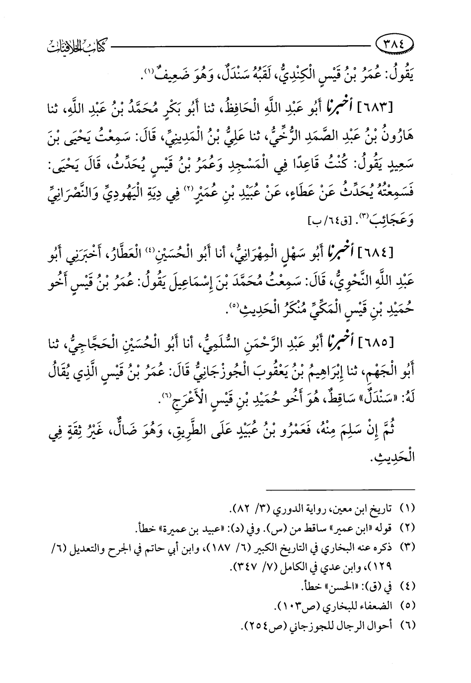 [685] أخبرنا أَبُو عَبْدِ الرَّحْمَنِ السُّلَمِيُّ، أنا أَبُو الْحُسَيْنِ الْحَجَّاجِيُّ، ثنا أَبُو الْجَهْمِ، ثنا إِبْرَاهِيمُ بْنُ يَعْقُوبَ الْجُوزْجَانِيُّ قَالَ: عُمَرُ بْنُ قَيْسٍ الَّذِي يُقَالُ لَهُ: "سَنْدَلٌ" سَاقِطٌ، هُوَ أَخُو حُمَيْدِ بْنِ قَيْسٍ الْأَعْرَجِ (¬6).