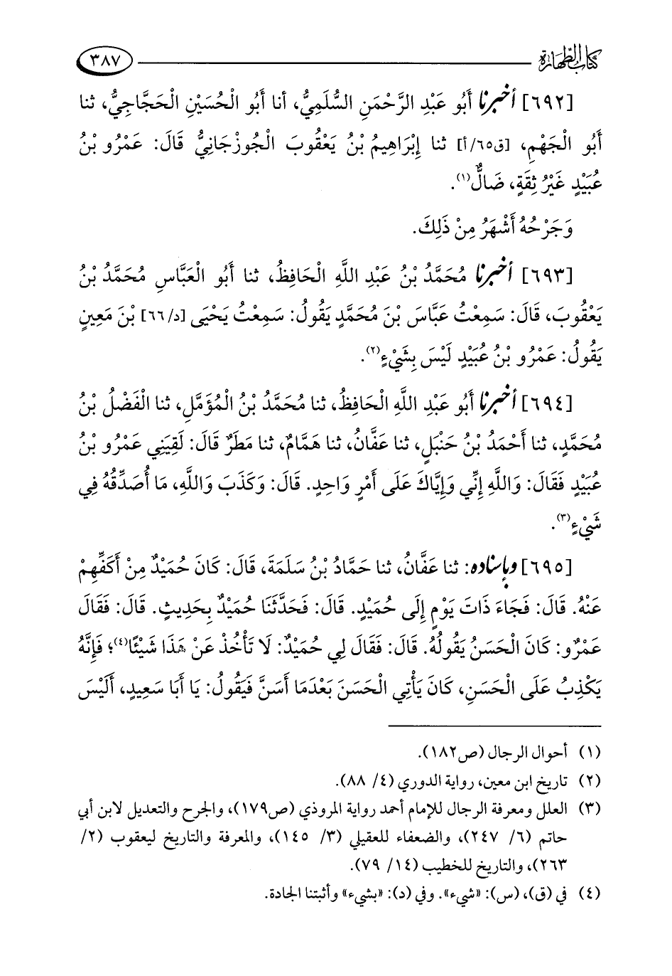 [693] أخبرنا مُحَمَّدُ بْنُ عَبْدِ اللَّهِ الْحَافِظُ، ثنا أَبُو الْعَبَّاسِ مُحَمَّدُ بْنُ يَعْقُوبَ، قَالَ: سَمِعْتُ عَبَّاسَ بْنَ مُحَمَّدٍ يَقُولُ: سَمِعْتُ يَحْيَى بْنَ مَعِينٍ يَقُولُ: عَمْرُو بْنُ عُبَيْدٍ لَيْسَ بِشَيْءٍ (¬2).