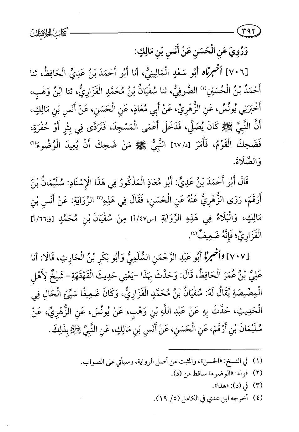 [706] أخبرناه أَبُو سَعْدٍ الْمَالِينِيُّ، أنا أَبُو أَحْمَدَ بْنُ عَدِيٍّ الْحَافِظُ، ثنا أَحْمَدُ بْنُ الْحُسَيْنِ (¬1) الصُّوفِيُّ، ثنا سُفْيَانُ بْنُ مُحَمَّدٍ الْفَزَارِيُّ، ثنا ابْنُ وَهْبٍ، أَخْبَرَنِي يُونُسُ، عَنِ الزُّهْرِيِّ، عَنْ أَبِي مُعَاذٍ، عَنِ الْحَسَنِ، عَنْ أَنَسِ بْنِ مَالِكٍ، أَنَّ النَّبِيَّ - صلى الله عليه وسلم - كانَ يُصَلِّي، فَدَخَلَ أَعْمَى الْمَسْجِدَ، فَتَرَدَّى فِي بِئْرٍ أَوْ حُفْرَةٍ، فَضَحِكَ الْقَوْمُ، فَأَمَرَ النَّبِيُّ - صلى الله عليه وسلم - مَنْ ضَحِكَ أَنْ يُعِيدَ الْوُضُوءَ (¬2) وَالصَّلَاةَ.