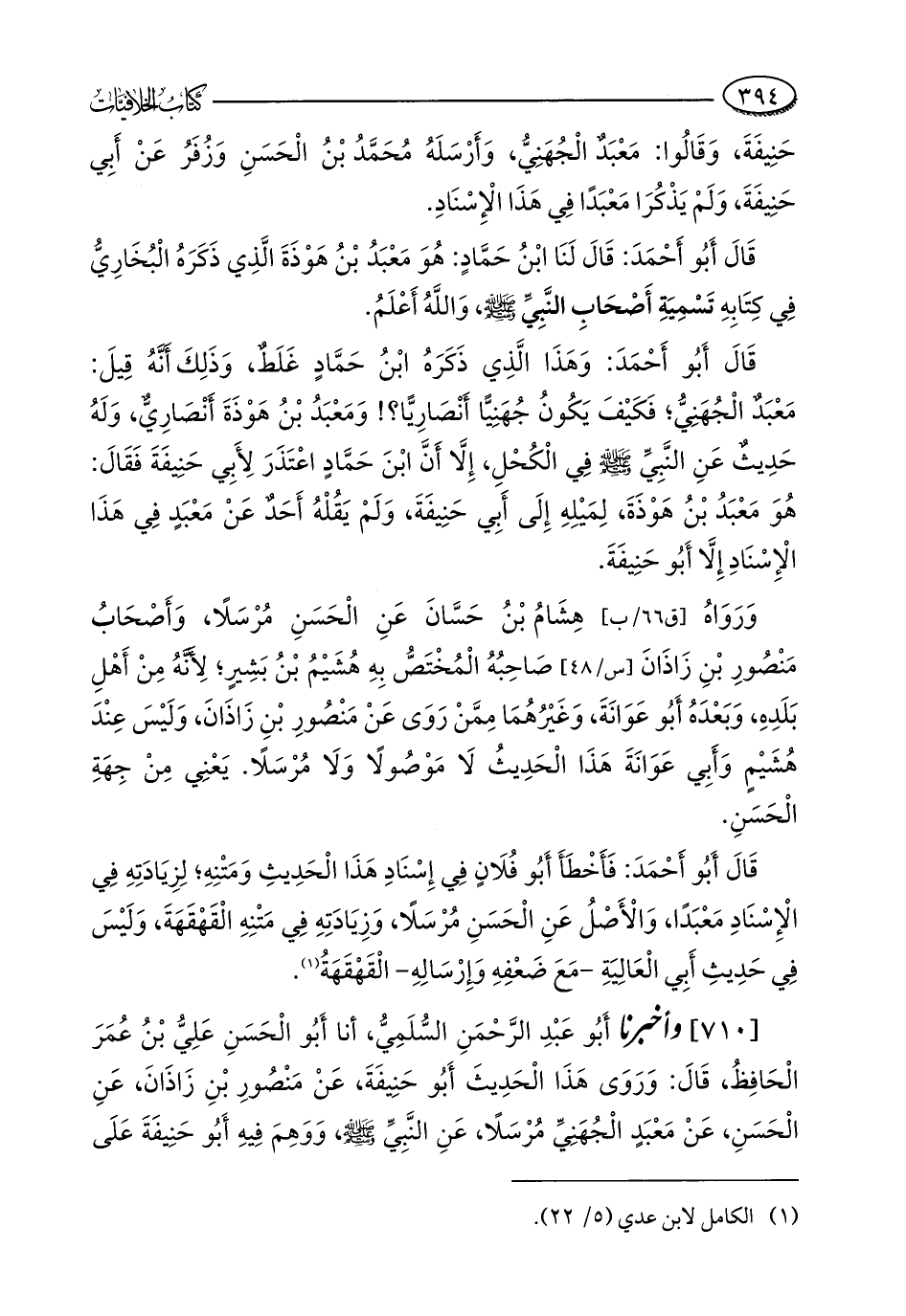 [710] وأخبرنا أَبُو عَبْدِ الرَّحْمَنِ السُّلَمِيُّ، أنا أَبُو الْحَسَنِ عَلِيُّ بْنُ عُمَرَ الْحَافِظُ، قَالَ: وَرَوَى هَذَا الْحَدِيثَ أَبُو حَنِيفَةَ، عَنْ مَنْصُورِ بْنِ زَاذَانَ، عَنِ الْحَسَنِ، عَنْ مَعْبَدٍ الْجُهَنِيِّ مُرْسَلًا، عَنِ النَّبِيِّ - صلى الله عليه وسلم -، وَوَهِمَ فِيهِ أَبُو حَنِيفَةَ عَلَى