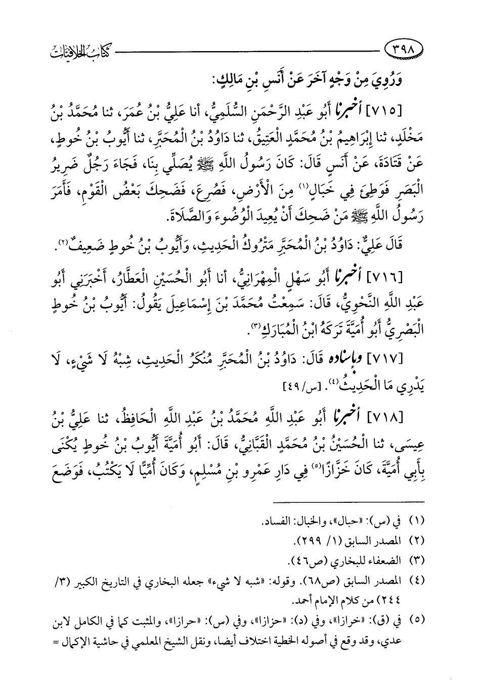 [716] أخبرنا أَبُو سهْلٍ الْمِهْرَانِيُّ، أنا أَبُو الْحُسَيْنِ الْعَطَّارُ، أَخْبَرَني أَبُو عَبْدِ اللَّهِ النَّحْوِيُّ، قَالَ: سَمِعْتُ مُحَمَّدَ بْنَ إِسْمَاعِيلَ يَقُولُ: أَيُّوبُ بْنُ خُوطٍ الْبَصْرِيُّ أَبُو أُمَيَّةَ تَرَكَهُ ابْنُ الْمُبَارَكِ (¬3).