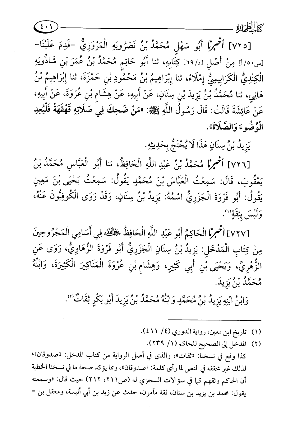 [725] أخبرنا أَبُو سَهْلٍ مُحَمَّدُ بْنُ نَصْرُويَهِ الْمَرْوَزِيُّ - قَدِمَ عَلَيْنَا - مِنْ أَصْلِ كِتَابِهِ، ثنا أَبُو حَاتِمٍ مُحَمَّدُ بْنُ عُمَرَ بْنِ شَاذُويَهِ الْكِنْدِيُّ الْكَرَابِيسِيُّ إِمْلَاءً، ثنا إِبْرَاهِيمُ بْنُ مَحْمُودِ بْنِ حَمْزَةَ، ثنا إِبْرَاهِيمُ بْنُ هَانِئٍ، ثنا مُحَمَّدُ بْنُ يَزِيدَ بْنِ سِنَانٍ، عَنْ أَبِيهِ، عَنْ هِشَامِ بْنِ عُرْوَةَ، عَنْ أَبِيهِ، عَنْ عَائِشَةَ قَالَتْ: قَالَ رَسُولُ اللَّهِ - صلى الله عليه وسلم -: "مَنْ ضَحِكَ فِي صَلَاتِهِ قَهْقَهَةً فَلْيُعِدِ الْوُضُوءَ وَالصَّلَاةَ".