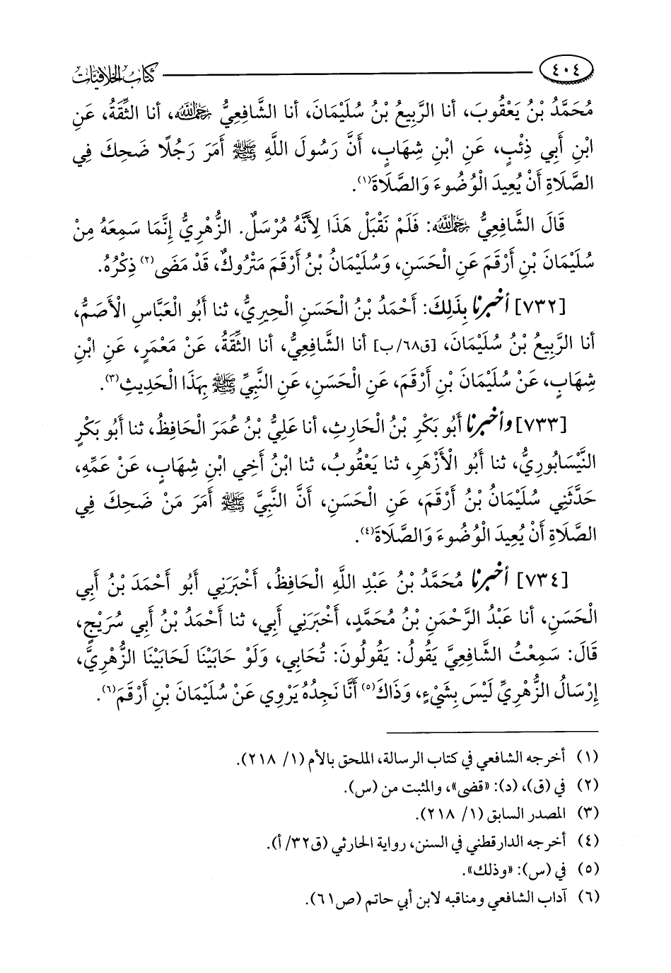 مُحَمَّدُ بْنُ يَعْقُوبَ، أنا الرَّبِيعُ بْنُ سُلَيْمَانَ، أنا الشَّافِعِيُّ - رحمه الله -، أنا الثِّقَةُ، عَنِ ابْنِ أَبِي ذِئْبٍ، عَنِ ابْنِ شِهَابٍ، أَنَّ رَسُولَ اللَّهِ - صلى الله عليه وسلم - أَمَرَ رَجُلًا ضَحِكَ فِي الصَّلَاةِ أَنْ يُعِيدَ الْوُضُوءَ وَالصَّلَاةَ (¬1).