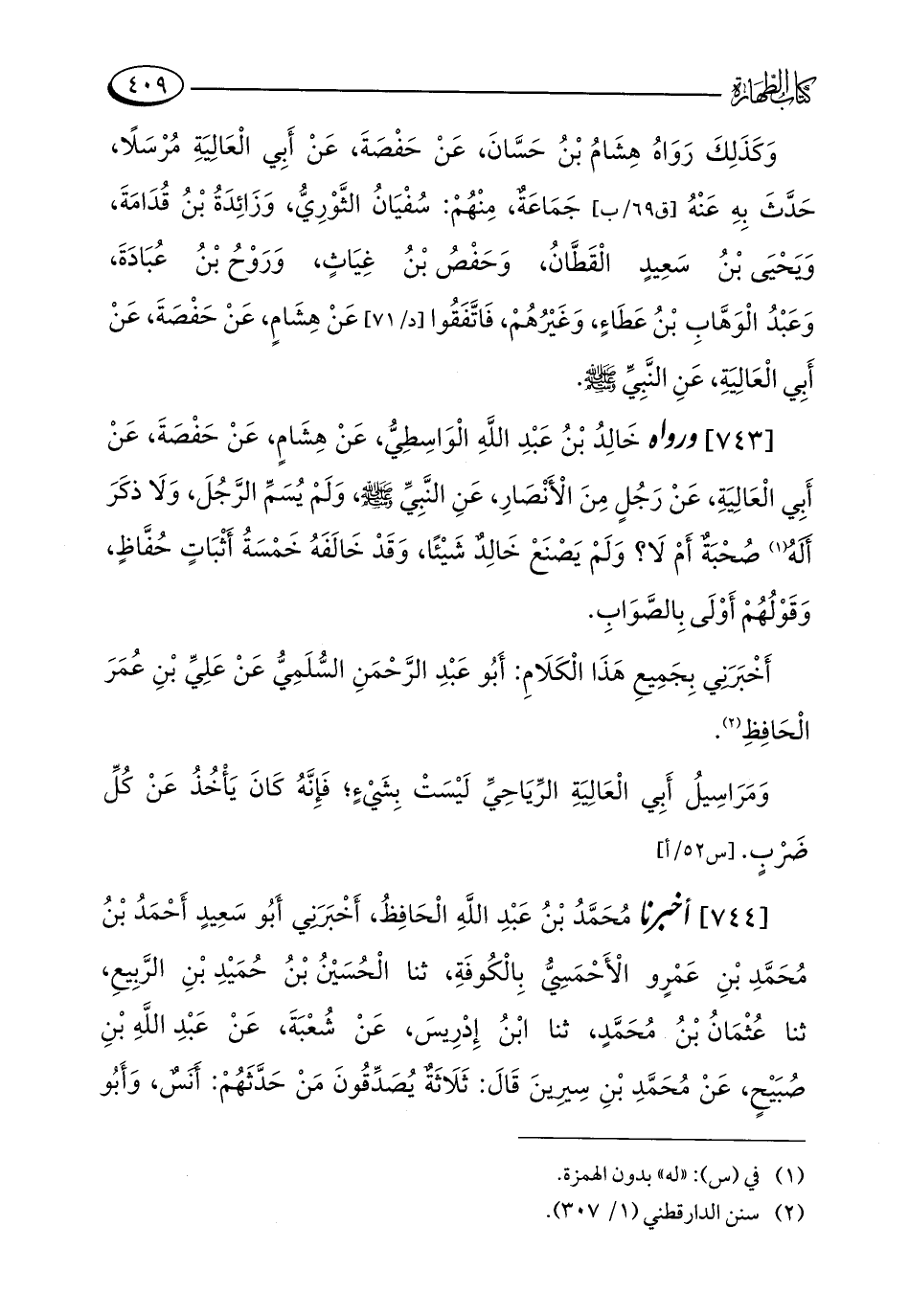 وَكَذَلِكَ رَوَاهُ هِشَامُ بْنُ حَسَّانَ، عَنْ حَفْصَةَ، عَنْ أَبِي الْعَالِيَةِ مُرْسَلًا، حَدَّثَ بِهِ عَنْهُ جَمَاعَةٌ، مِنْهُمْ: سُفْيَانُ الثَّوْرِيُّ، وَزَائِدَةُ بْنُ قُدَامَةَ، وَيحْيَى بْنُ سَعِيدٍ الْقَطَّانُ، وَحَفْصُ بْنُ غِيَاثٍ، وَرَوْحُ بْنُ عُبَادَةَ، وَعَبْدُ الْوَهَّابِ بْنُ عَطَاءٍ، وَغَيْرُهُمْ، فَاتَّفَقُوا عَنْ هِشَامٍ، عَنْ حَفْصَةَ، عَنْ أَبِي الْعَالِيَةِ، عَنِ النَّبِيِّ - صلى الله عليه وسلم -.