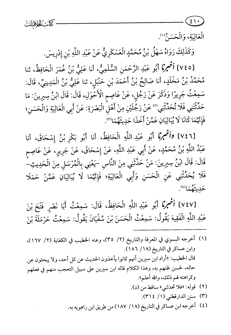 [745] أخبرنا أَبُو عَبْدِ الرَّحْمَنِ السُّلَمِيُّ، أنا عَلِيُّ بْنُ عُمَرَ الْحَافِظُ، ثنا مُحَمَّدُ بْنُ مَخْلَدٍ، أنا صَالِحُ بْنُ أَحْمَدَ بْنِ حَنْبَلٍ، ثنا عَلِيُّ بْنُ الْمَدِينِيِّ، قَالَ: سَمِعْتُ جَرِيرًا وَذَكَرَ عَنْ رَجُلٍ، عَنْ عَاصِمٍ الْأَحْوَلِ، قَالَ: قَالَ ابْنُ سِيرِينَ: مَا حَدَّثْتَنِي فَلَا تُحَدِّثْنِي (¬2) عَنْ رَجُلَيْنِ مِنْ أَهْلِ الْبَصْرَةِ: عَنْ أَبِي الْعَالِيَةِ وَالْحَسَنِ؛ فَإِنَّهُمَا كَانَا لَا يُبَالِيَانِ عَمَّنْ أَخَذَا حَدِيثَهُمَا (¬3).