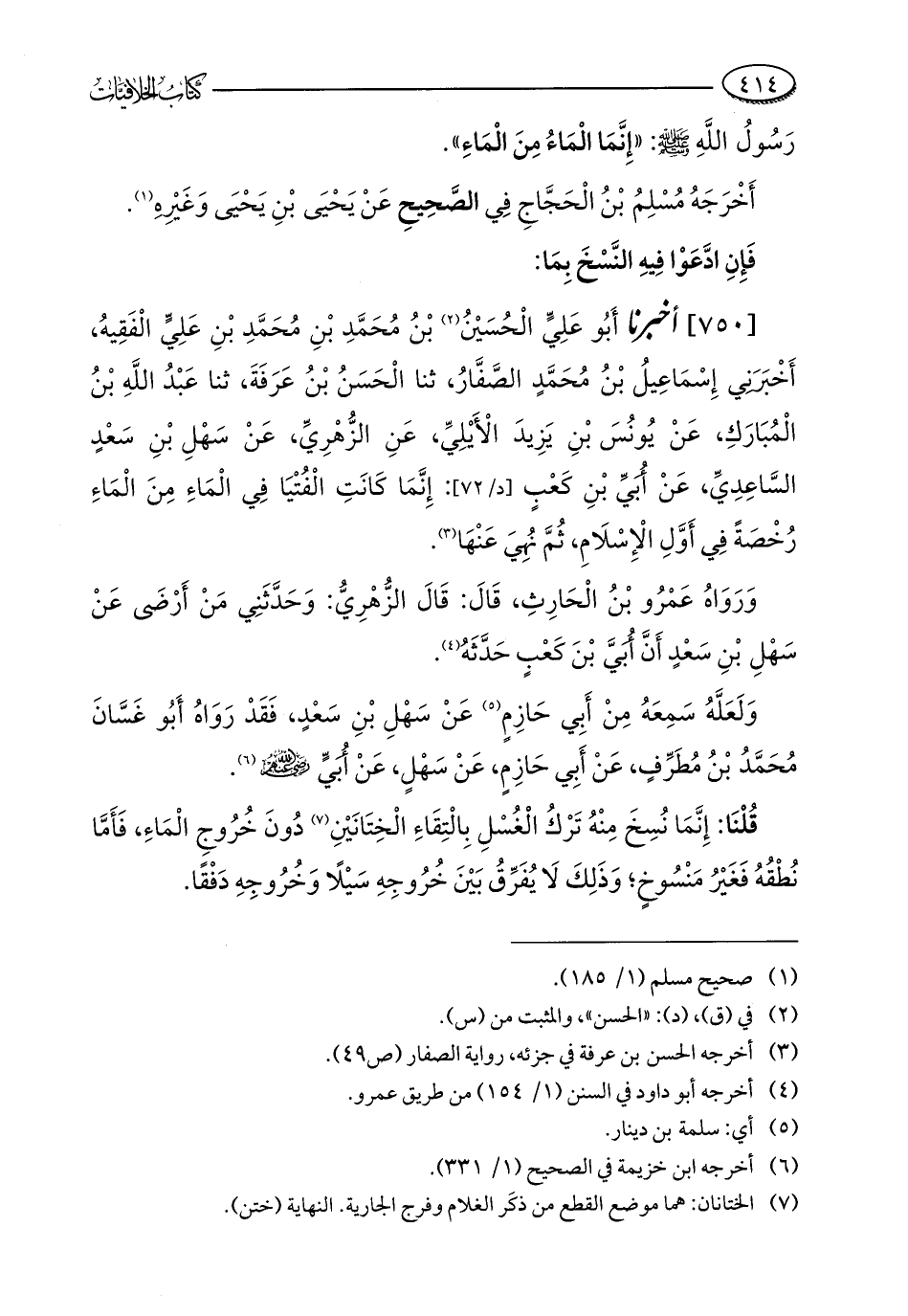 [750] أخبرنا أَبُو عَلِيٍّ الْحُسَيْنُ (¬2) بْنُ مُحَمَّدِ بْنِ مُحَمَّدِ بْنِ عَلِيٍّ الْفَقِيهُ، أَخْبَرَنِي إِسْمَاعِيلُ بْنُ مُحَمَّدٍ الصَّفَّارُ، ثنا الْحَسَنُ بْنُ عَرَفَةَ، ثنا عَبْدُ اللَّهِ بْنُ الْمُبَارَكِ، عَنْ يُونُسَ بْنِ يَزِيدَ الْأَيْلِيِّ، عَنِ الزُّهْرِيِّ، عَنْ سَهْلِ بْنِ سَعْدٍ السَّاعِدِيِّ، عَنْ أُبَيِّ بْنِ كَعْبٍ: إِنَّمَا كَانَتِ الْفُتْيَا في الْمَاءِ مِنَ الْمَاءِ رُخْصَةً فِي أَوَّلِ الْإِسْلَامِ، ثُمَّ نُهِيَ عَنْهَا (¬3).