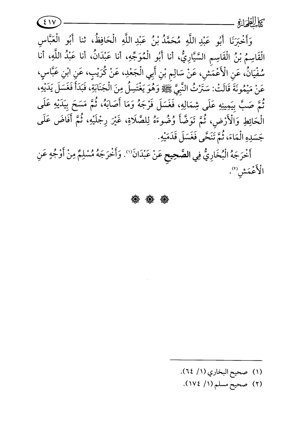 وَأَخْبَرَنَا أَبُو عَبْدِ اللَّهِ مُحَمَّدُ بْنُ عَبْدِ اللَّهِ الْحَافِظُ، ثنا أَبُو الْعَبَّاسِ الْقَاسِمُ بْنُ الْقَاسِمِ السَّيَّارِيُّ، أنا أَبُو الْمُوَجِّهِ، أنا عَبْدَانُ، أنا عَبْدُ اللَّهِ، أنا سُفْيَانُ، عَنِ الْأَعْمَشِ، عَنْ سَالِمِ بْنِ أَبِي الْجَعْدِ، عَنْ كُرَيْبٍ، عَنِ ابْنِ عَبَّاسٍ، عَنْ مَيْمُونَةَ قَالَتْ: سَتَرْتُ النَّبِيَّ - صلى الله عليه وسلم - وهُوَ يَغْتَسِلُ مِنَ الْجَنَابَةِ، فَبَدَأَ فَغَسَلَ يَدَيْهِ، ثُمَّ صَبَّ بِيَمِينِهِ عَلَى شِمَالِهِ، فَغَسَلَ فَرْجَهُ وَمَا أَصَابَهُ، ثُمَّ مَسَحَ بِيَدَيْهِ عَلَى الْحَائِطِ وَالْأَرْضِ، ثُمَّ تَوَضَّأَ وُضُوءَهُ لِلصَّلَاةِ، غَيْرَ رِجْلَيْهِ، ثُمَّ أَفَاضَ عَلَى جَسَدِهِ الْمَاءَ، ثُمَّ تَنَحَّى فَغَسَلَ قَدَمَيْهِ.