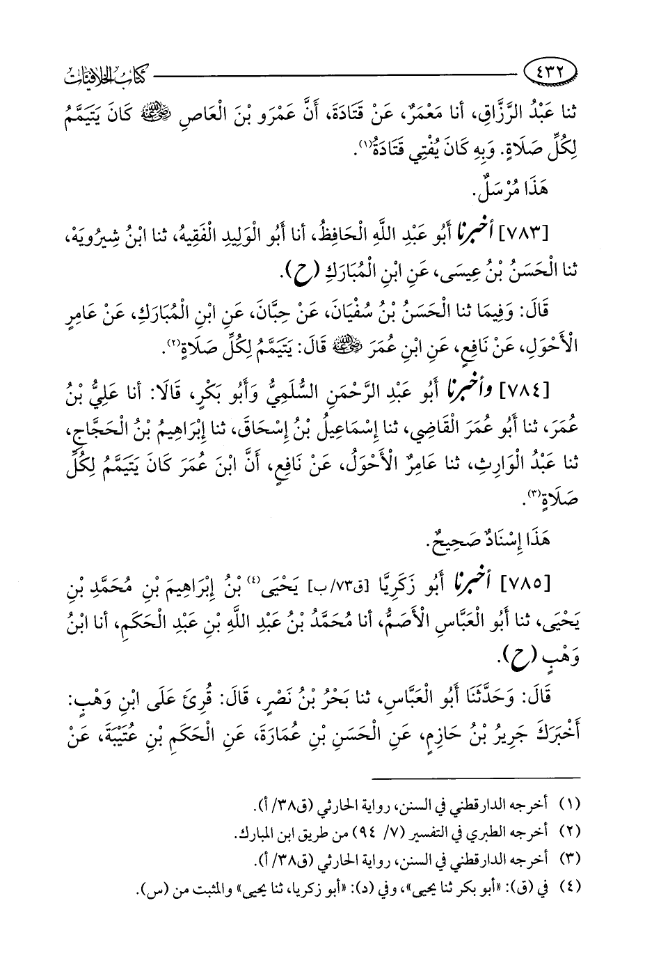 [784] وأخبرنا أَبُو عَبْدِ الرَّحْمَنِ السُّلَمِيُّ وَأَبُو بَكْرٍ، قَالَا: أنا عَلِيُّ بْنُ عُمَرَ، ثنا أَبُو عُمَرَ الْقَاضِي، ثنا إِسْمَاعِيلُ بْنُ إِسْحَاقَ، ثنا إِبْرَاهِيمُ بْنُ الْحَجَّاجِ، ثنا عَبْدُ الْوَارِثِ، ثنا عَامِرٌ الْأَحْوَلُ، عَنْ نَافِعٍ، أَنَّ ابْنَ عُمَرَ كَانَ يَتيَمَّمُ لِكُلِّ صَلَاةٍ (¬3).