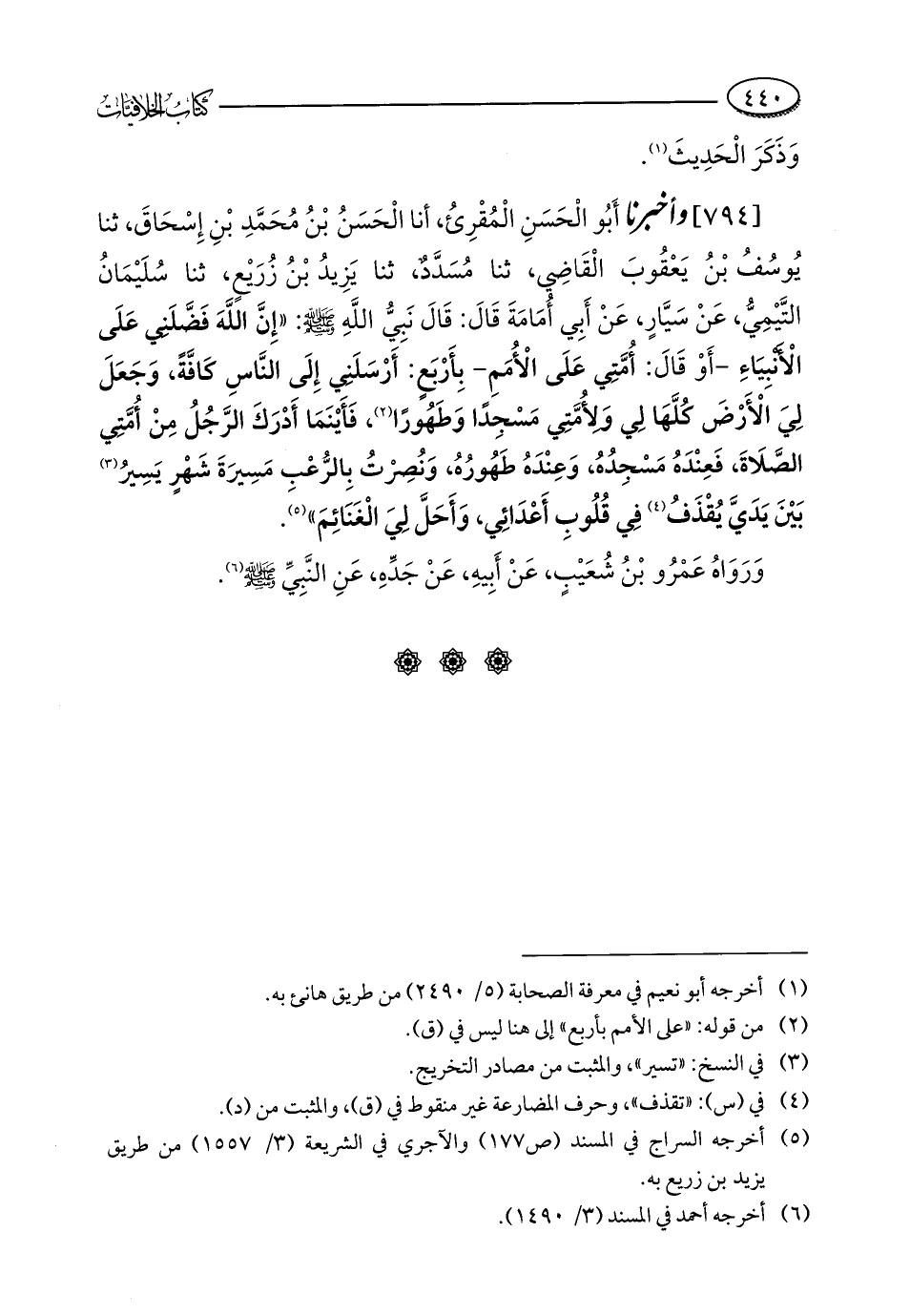[794] وأخبرنا أَبُو الْحَسَنِ الْمُقْرِئُ، أنا الْحَسَنُ بْنُ مُحَمَّدِ بْنِ إِسْحَاقَ، ثنا يُوسُفُ بْنُ يَعْقُوبَ الْقَاضِي، ثنا مُسَدَّدٌ، ثنا يَزِيدُ بْنُ زُرَيْعٍ، ثنا سُلَيْمَانُ التَّيْمِيُّ، عَنْ سَيَّارٍ، عَنْ أَبِي أُمَامَةَ قَالَ: قَالَ نَبِيُّ اللَّهِ - صلى الله عليه وسلم -: "إِنَّ اللَّهَ فَضَّلَنِي عَلَى الْأَنْبِيَاءِ - أَوْ قَالَ: أُمَّتِي عَلَى الْأُمَمِ - بِأَرْبَعٍ: أَرْسَلَنِي إِلَى النَّاسِ كَافَّةً، وَجَعَلَ لِيَ الْأَرْضَ كُلَّهَا لِي وَلِأُمَّتِي مَسْجِدًا وَطَهُورًا (¬2)، فَأَيْنَمَا أَدْرَكَ الرَّجُلُ مِنْ أُمَّتِي الصَّلَاةَ، فَعِنْدَهُ مَسْجِدُهُ، وَعِنْدَهُ طَهُورُهُ، وَنُصِرْتُ بِالرُّعْبِ مَسِيرَةَ شَهْرٍ يَسِيرُ (¬3) بَيْنَ يَدَيَّ يُقْذَفُ (¬4) فِي قُلُوبِ أَعْدَائِي، وَأَحَلَّ لِيَ الْغَنَائِمَ" (¬5).