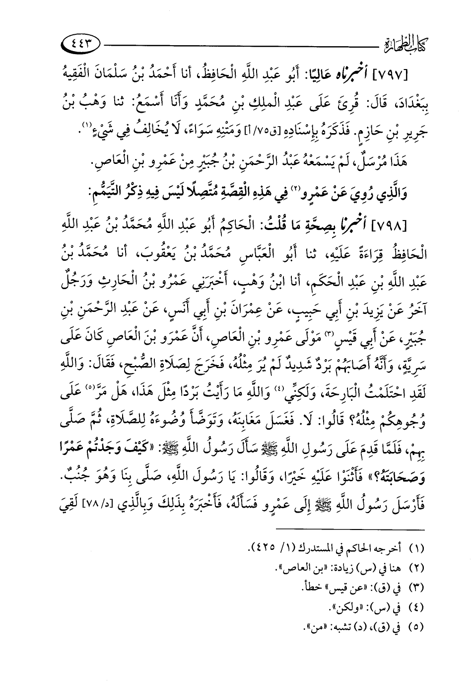[798] أخبرنا بِصِحَّةِ مَا قُلْتُ: الْحَاكِمُ أَبُو عَبْدِ اللَّهِ مُحَمَّدُ بْنُ عَبْدِ اللَّهِ الْحَافِظُ قِرَاءَةً عَلَيْهِ، ثنا أَبُو الْعَبَّاسِ مُحَمَّدُ بْنُ يَعْقُوبَ، أنا مُحَمَّدُ بْنُ عَبْدِ اللَّهِ بْنِ عَبْدِ الْحَكَمِ، أنا ابْنُ وَهْبٍ، أَخْبَرَنِي عَمْرُو بْنُ الْحَارِثِ وَرَجُلٌ آخَرُ عَنْ يَزِيدَ بْنِ أَبِي حَبِيبٍ، عَنْ عِمْرَانَ بْنِ أَبِي أَنَسٍ، عَنْ عَبْدِ الرَّحْمَنِ بْنِ جُبَيْرٍ، عَنْ أَبِي قَيْسٍ (¬3) مَوْلَى عَمْرِو بْنِ الْعَاصِ، أَنَّ عَمْرَو بْنَ الْعَاصِ كَانَ عَلَى سَرِيَّةٍ، وَأَنَّهُ أَصَابَهُمْ بَرْدٌ شَدِيدٌ لَمْ يُرَ مِثْلُهُ، فَخَرَجَ لِصَلَاةِ الصُّبْحِ، فَقَالَ: وَاللَّهِ لَقَدِ احْتَلَمْتُ الْبَارِحَةَ، وَلَكِنِّي (¬4) وَاللَّهِ مَا رَأَيْتُ بَرْدًا مِثْلَ هَذَا، هَلْ مَرَّ (¬5) عَلَى وُجُوهِكُمْ مِثْلُهُ؟ قَالُوا: لَا. فَغَسَلَ مَغَابِنَهُ، وَتَوَضَّأَ وُضُوءَهُ لِلصَّلَاةِ، ثُمَّ صَلَّى بِهِمْ، فَلَمَّا قَدِمَ عَلَى رَسُولِ اللَّهِ - صلى الله عليه وسلم - سَأَلَ رَسُولُ اللَّهِ - صلى الله عليه وسلم -: "كَيْفَ وَجَدْتُمْ عَمْرًا وَصَحَابَتَهُ؟ " فَأَثْنَوْا عَلَيْهِ خَيْرًا، وَقَالُوا: يَا رَسُولَ اللَّهِ، صَلَّى بِنَا وَهُوَ جُنُبٌ. فَأَرْسَلَ رَسُولُ اللَّهِ - صلى الله عليه وسلم - إلَى عَمْرٍو فَسَأَلَهُ، فَأَخْبَرَهُ بِذَلِكَ وَبِالَّذِي لَقِيَ