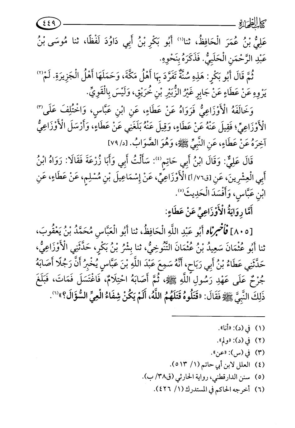 [805] فأخبرناه أَبُو عَبْدِ اللَّهِ الْحَافِظُ، ثنا أَبُو الْعَبَّاسِ مُحَمَّدُ بْنُ يَعْقُوبَ، ثنا أَبُو عُثْمَانَ سَعِيدُ بْنُ عُثْمَانَ التَّنُوخِيُّ، ثنا بِشْرُ بْنُ بَكْرٍ، حَدَّثَنِي الْأَوْزَاعِيُّ، حَدَّثَنِي عَطَاءُ بْنُ أَبِي رَبَاحٍ، أَنَّهُ سَمِعَ عَبْدَ اللَّهِ بْنَ عَبَّاسٍ يُخْبِرُ أَنَّ رَجُلًا أَصَابَهُ جُرْحٌ عَلَى عَهْدِ رَسُولِ اللَّهِ - صلى الله عليه وسلم -، ثُمَّ أَصَابَهُ احْتِلَامٌ، فَاغْتَسَلَ فَمَاتَ، فَبَلَغَ ذَلِكَ النَّبِيَّ - صلى الله عليه وسلم - فَقَالَ: "قَتَلُوهُ قَتَلَهُمُ اللَّهُ، أَلَمْ يَكُنْ شِفَاءُ الْعِيِّ السُّؤَالَ؟ " (¬6).
