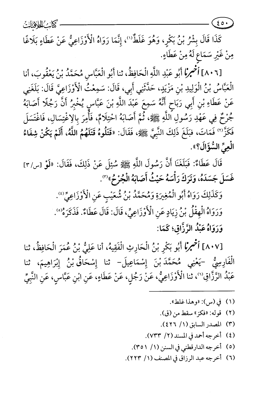 [806] أخبرنا أَبُو عَبْدِ اللَّهِ الْحَافِظُ، ثنا أَبُو الْعَبَّاسِ مُحَمَّدُ بْنُ يَعْقُوبَ، أنا الْعَبَّاسُ بْنُ الْوَلِيدِ بْنِ مَزْيَدٍ، حَدَّثَنِي أَبِي، قَالَ: سَمِعْتُ الْأَوْزَاعِيَّ قَالَ: بَلَغَنِي عَنْ عَطَاءِ بْنِ أَبِي رَبَاحٍ أَنَّهُ سَمِعَ عَبْدَ اللَّهِ بْنَ عَبَّاسٍ يُخْبِرُ أَنَّ رَجُلًا أَصَابَهُ جُرْحٌ فِي عَهْدِ رَسُولِ اللَّهِ - صلى الله عليه وسلم -، ثُمَّ أَصَابَهُ احْتِلَامٌ، فَأمِرَ بِالِاغْتِسَالِ، فَاغْتَسَلَ فَكَزَّ (¬2) فَمَاتَ، فبَلَغَ ذَلِكَ النَّبِيَّ - صلى الله عليه وسلم -، فَقَالَ: "قَتَلُوهُ قَتَلَهُمُ اللَّهُ، أَلَمْ يَكُنْ شِفَاءُ الْعِيِّ السُّؤَالَ؟ ".