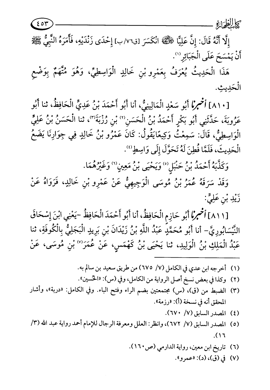 [810] أخبرنا أَبُو سَعْدٍ الْمَالِينِيُّ، أنا أَبُو أَحْمَدَ بْنُ عَدِيٍّ الْحَافِظُ، ثنا أَبُو عَرُوبَةَ، حَدَّثَنِي أَبُو بَكْرٍ أَحْمَدُ بْنُ الْحَسَنِ (¬2) بْنِ رُزْبَةَ (¬3)، ثنا الْحَسَنُ بْنُ عَلِيٍّ الْوَاسِطِيُّ، قَالَ: سَمِعْتُ وَكِيعًا يَقُولُ: كَانَ عَمْرُو بْنُ خَالِدٍ فِي جِوَارِنَا يَضَعُ الْحَدِيثَ، فَلَمَّا فُطِنَ لَهُ تَحَوَّلَ إِلَى وَاسِطٍ (¬4).